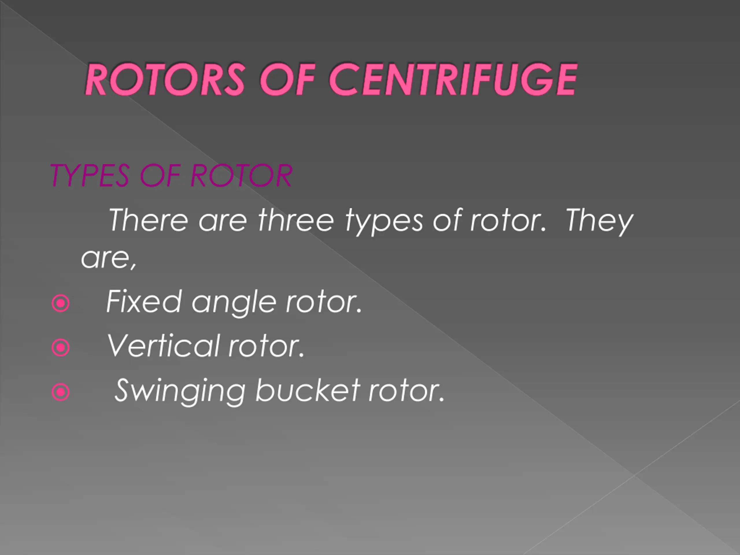 ROTORS OF CENTRIFUGE TYPES OF ROTOR There are three types of rotor. They are, Fixed angle rotor. Vertical rotor. Swinging bucket rotor.