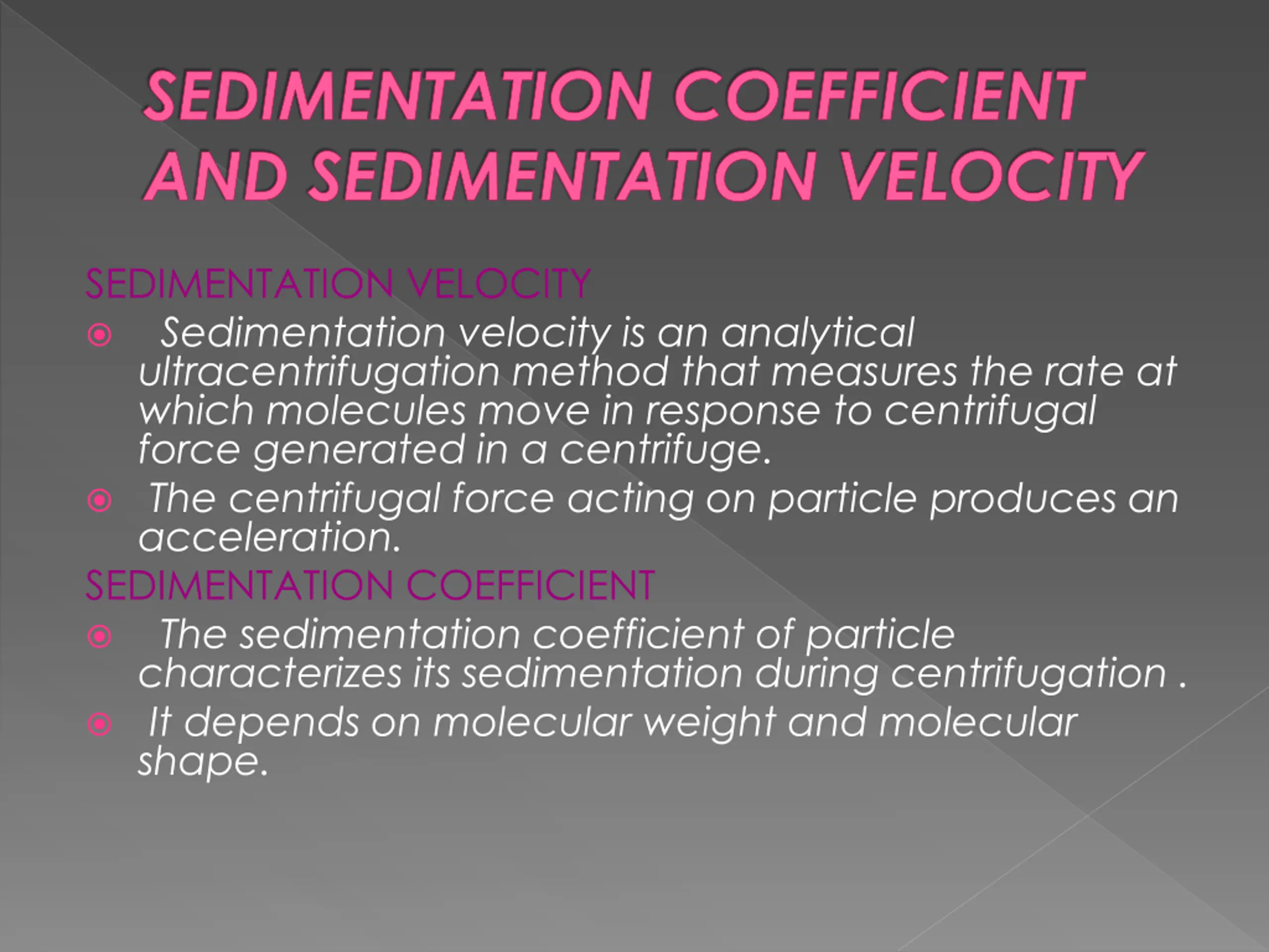 SEDIMENTATION COEFFICIENT AND SEDIMENTATION VELOCITY SEDIMENTATION VELOCITY Sedimentation velocity is an analytical ultracentrifugation method that measures the rate at which molecules move in response to centrifugal force generated in a centrifuge. The centrifugal force acting on particle produces an acceleration. SEDIMENTATION COEFFICIENT The sedimentation coefficient of particle characterizes its sedimentation during centrifugation . It depends on molecular weight and molecular shape.