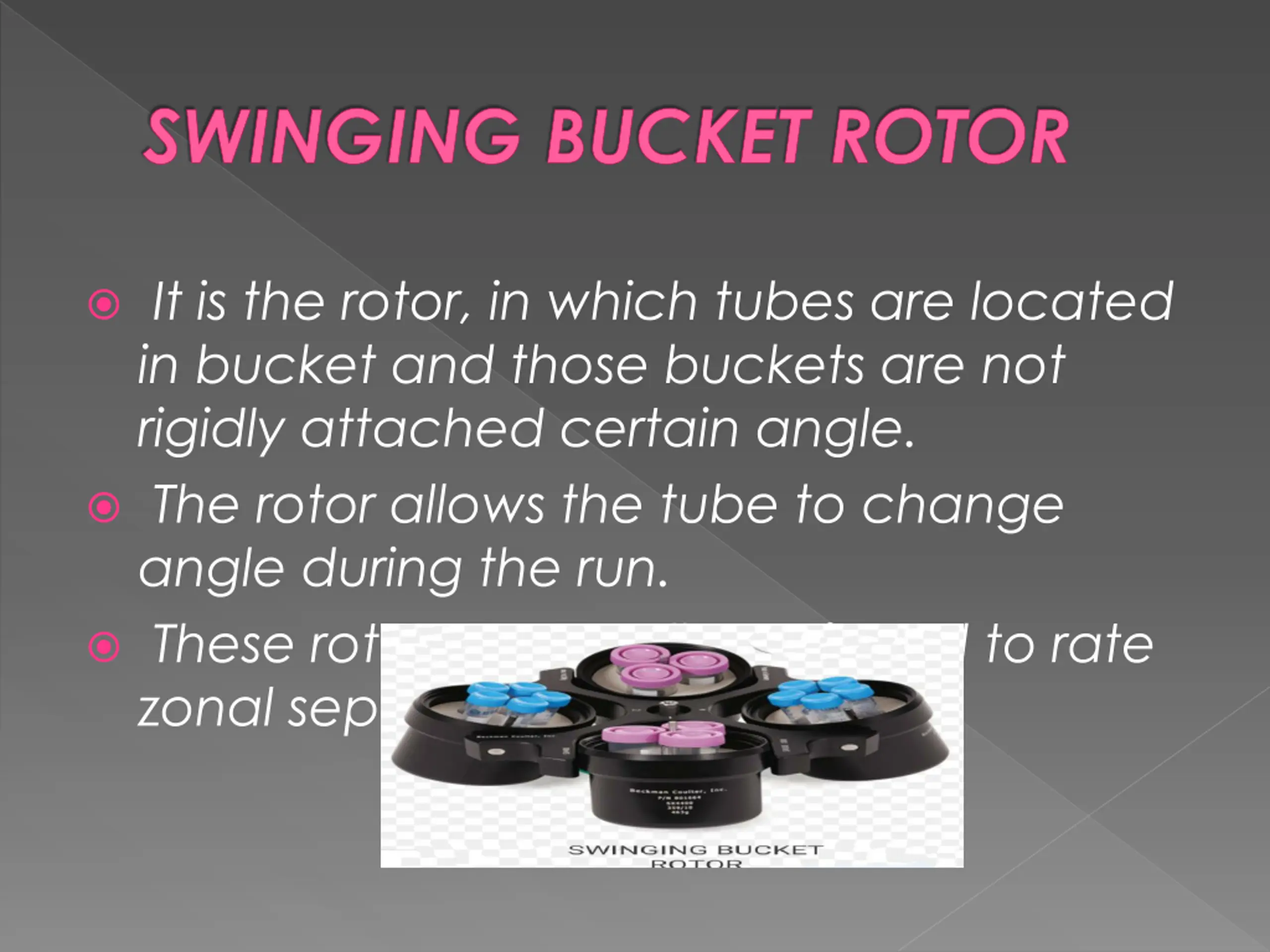 SWINGING BUCKET ROTOR It is the rotor, in which tubes are located in bucket and those buckets are not rigidly attached certain angle. The rotor allows the tube to change angle during the run. These rotor are usually preferred to rate zonal separation.