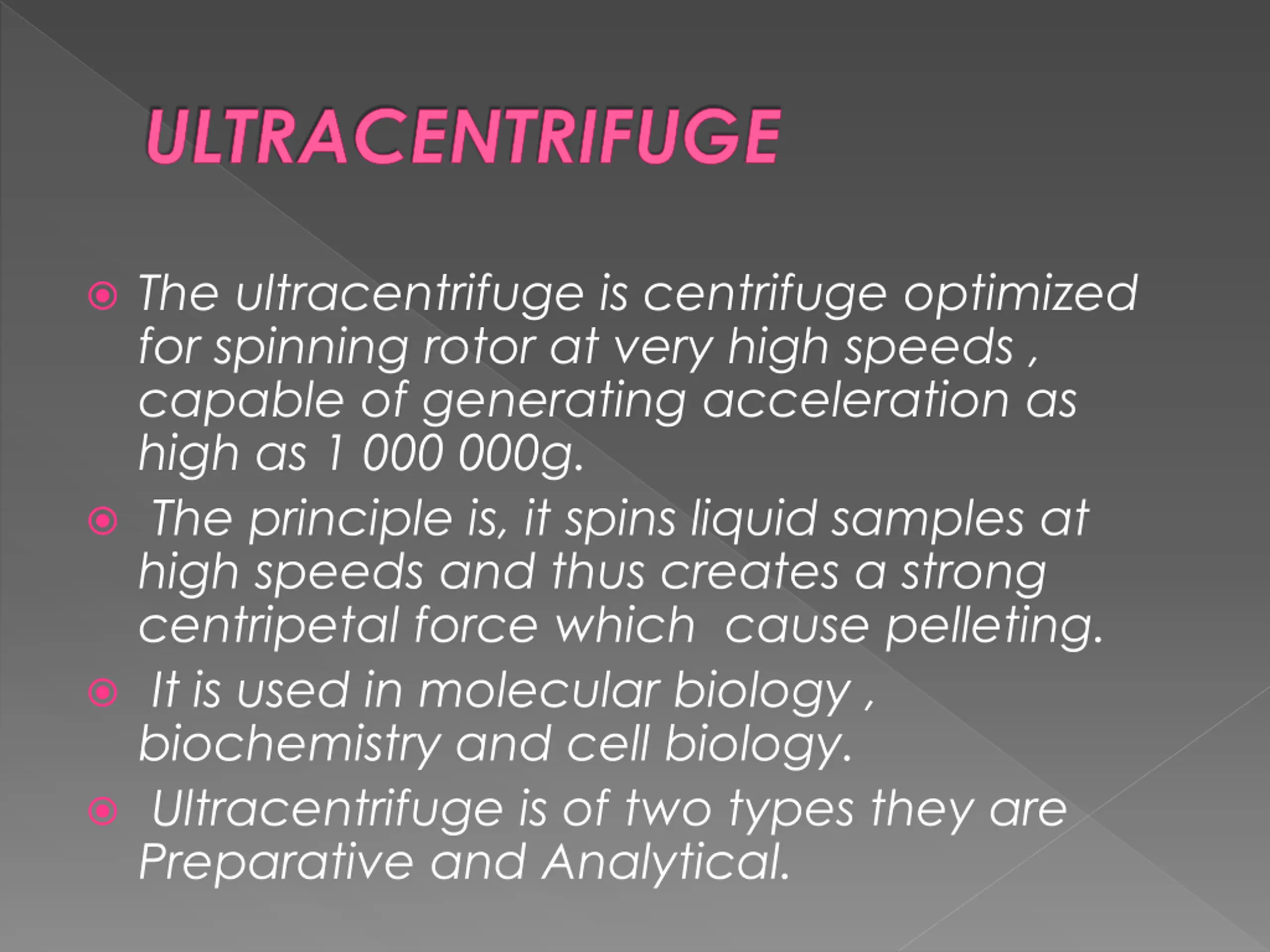 ULTRACENTRIFUGE The ultracentrifuge is centrifuge optimized for spinning rotor at very high speeds , capable of generating acceleration as high as 1 000 000g. The principle is, it spins liquid samples at high speeds and thus creates a strong centripetal force which cause pelleting. It is used in molecular biology , biochemistry and cell biology. Ultracentrifuge is of two types they are Preparative and Analytical.