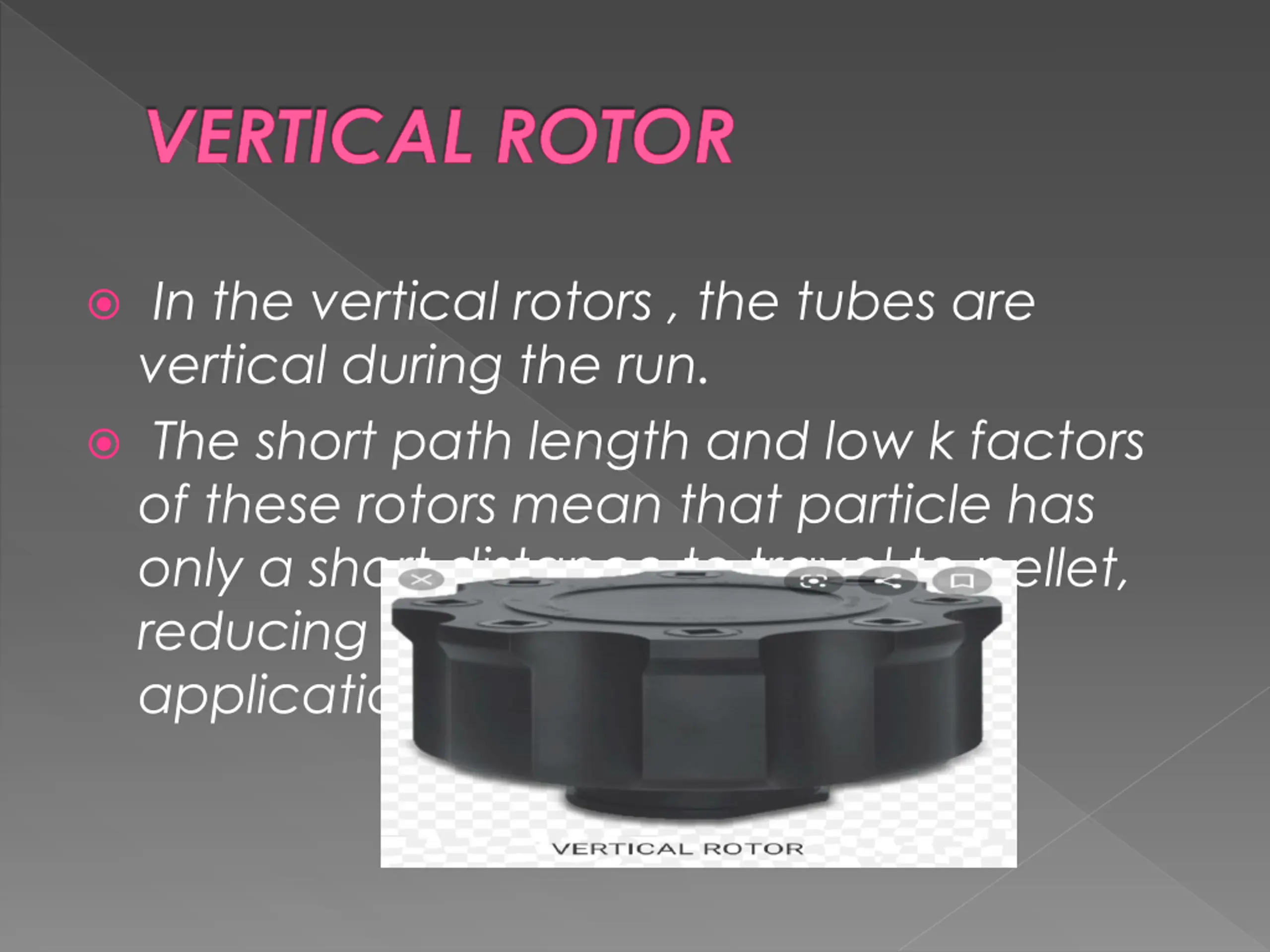 VERTICAL ROTOR In the vertical rotors , the tubes are vertical during the run. The short path length and low k factors of these rotors mean that particle has only a short distance to travel to pellet, reducing the run time for the application.