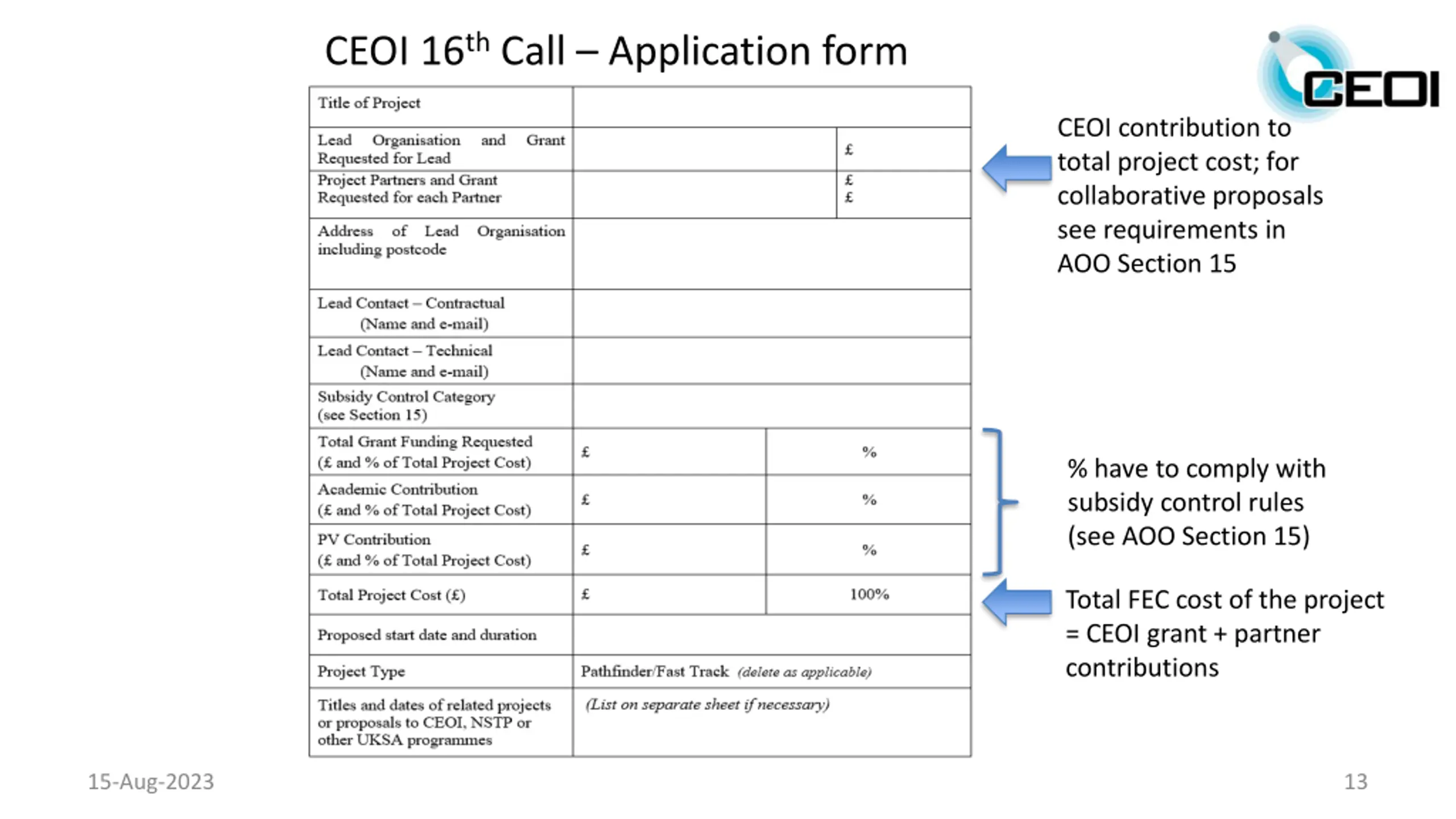 CEOI 16th Call Application form CEOI contribution to total project cost; for collaborative proposals see requirements in AOO Section 15 % have to comply with subsidy control rules (see AOO Section 15) Total FEC cost of the project = CEOI grant + partner contributions 15-Aug-2023 13