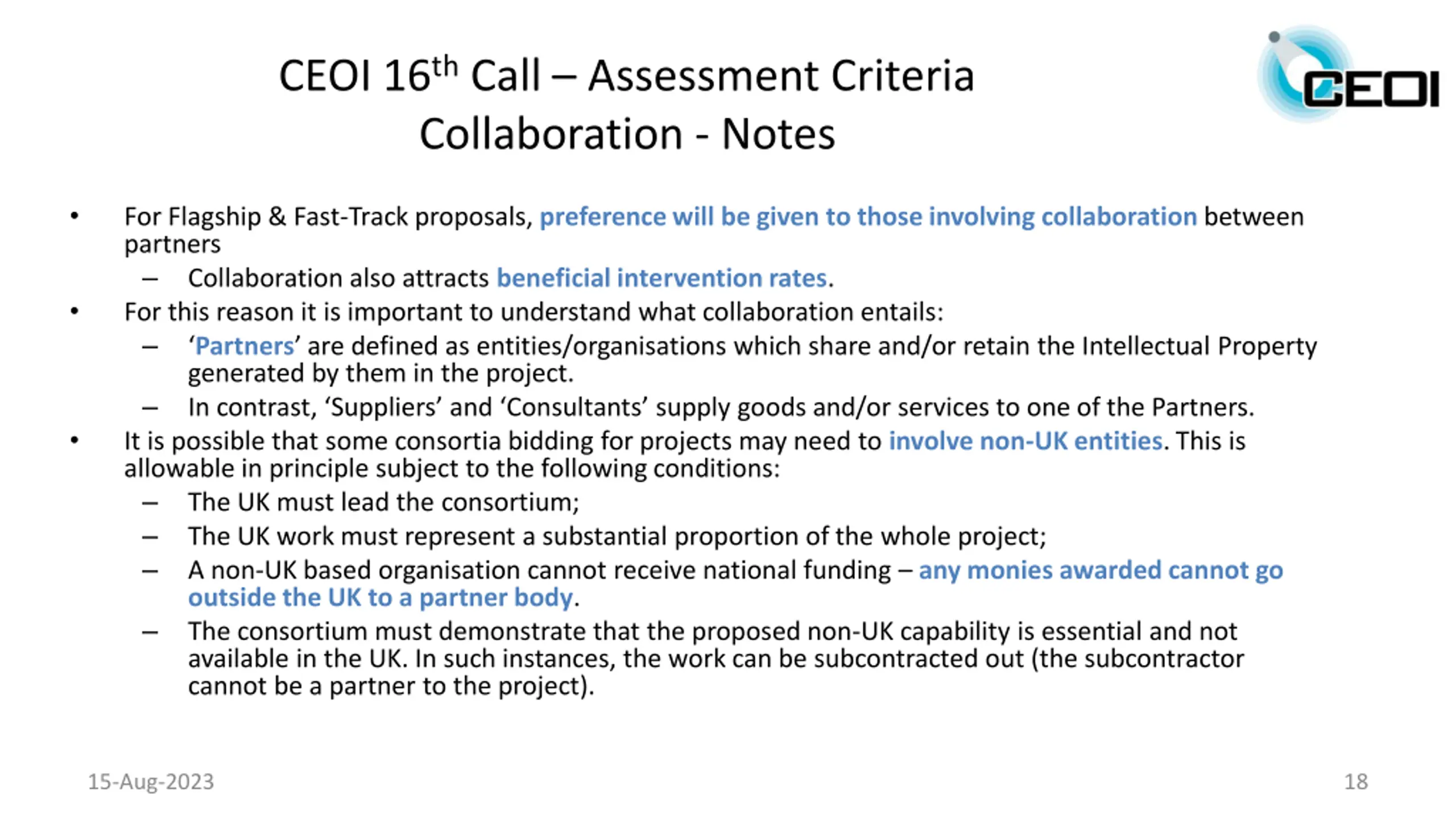 CEOI 16th Call Assessment Criteria Collaboration - Notes For Flagship & Fast-Track proposals, preference will be given to those involving collaboration between partners Collaboration also attracts beneficial intervention rates. For this reason it is important to understand what collaboration entails: Partners are defined as entities/organisations which share and/or retain the Intellectual Property generated by them in the project. In contrast, Suppliers and Consultants supply goods and/or services to one of the Partners. It is possible that some consortia bidding for projects may need to involve non-UK entities. This is allowable in principle subject to the following conditions: The UK must lead the consortium; The UK work must represent a substantial proportion of the whole project; A non-UK based organisation cannot receive national funding any monies awarded cannot go outside the UK to a partner body. The consortium must demonstrate that the proposed non-UK capability is essential and not available in the UK. In such instances, the work can be subcontracted out (the subcontractor cannot be a partner to the project). 15-Aug-2023 18
