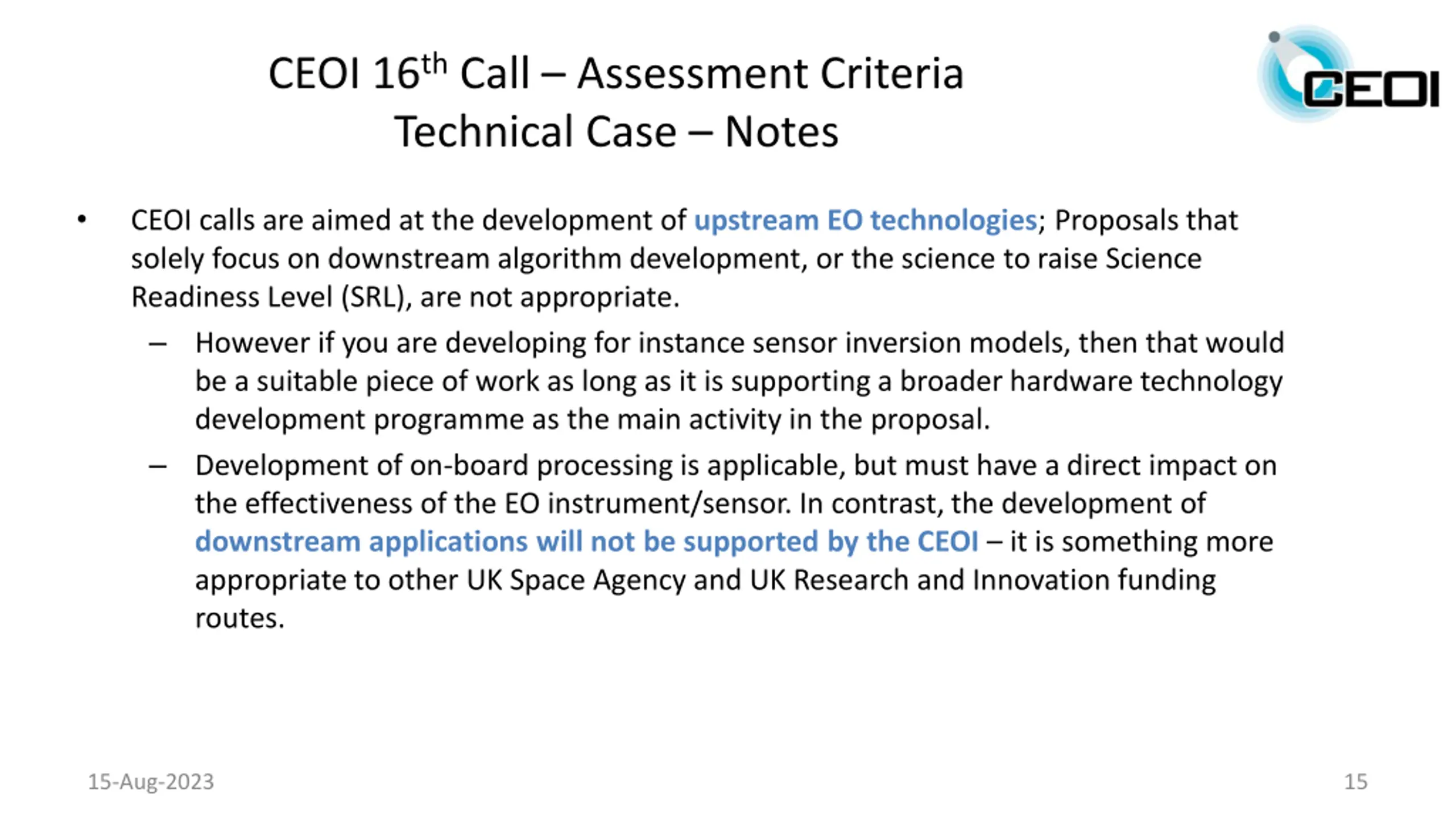 CEOI 16th Call Assessment Criteria Technical Case Notes CEOI calls are aimed at the development of upstream EO technologies; Proposals that solely focus on downstream algorithm development, or the science to raise Science Readiness Level (SRL), are not appropriate. However if you are developing for instance sensor inversion models, then that would be a suitable piece of work as long as it is supporting a broader hardware technology development programme as the main activity in the proposal. Development of on-board processing is applicable, but must have a direct impact on the effectiveness of the EO instrument/sensor. In contrast, the development of downstream applications will not be supported by the CEOI it is something more appropriate to other UK Space Agency and UK Research and Innovation funding routes. 15-Aug-2023 15