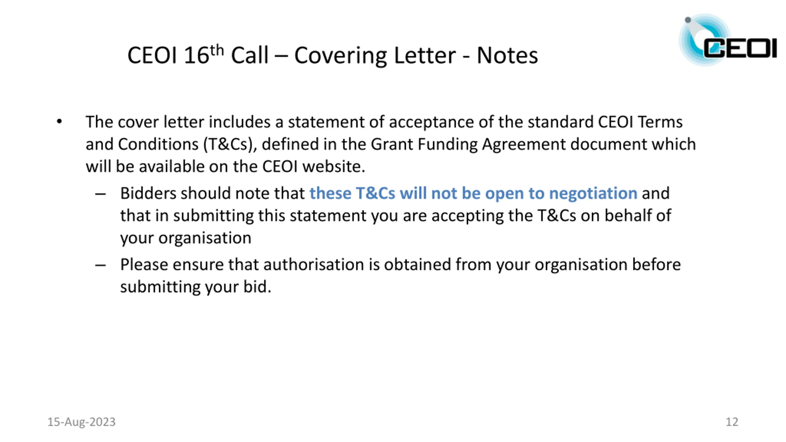 CEOI 16th Call Covering Letter - Notes The cover letter includes a statement of acceptance of the standard CEOI Terms and Conditions (T&Cs), defined in the Grant Funding Agreement document which will be available on the CEOI website. Bidders should note that these T&Cs will not be open to negotiation and that in submitting this statement you are accepting the T&Cs on behalf of your organisation Please ensure that authorisation is obtained from your organisation before submitting your bid. 15-Aug-2023 12
