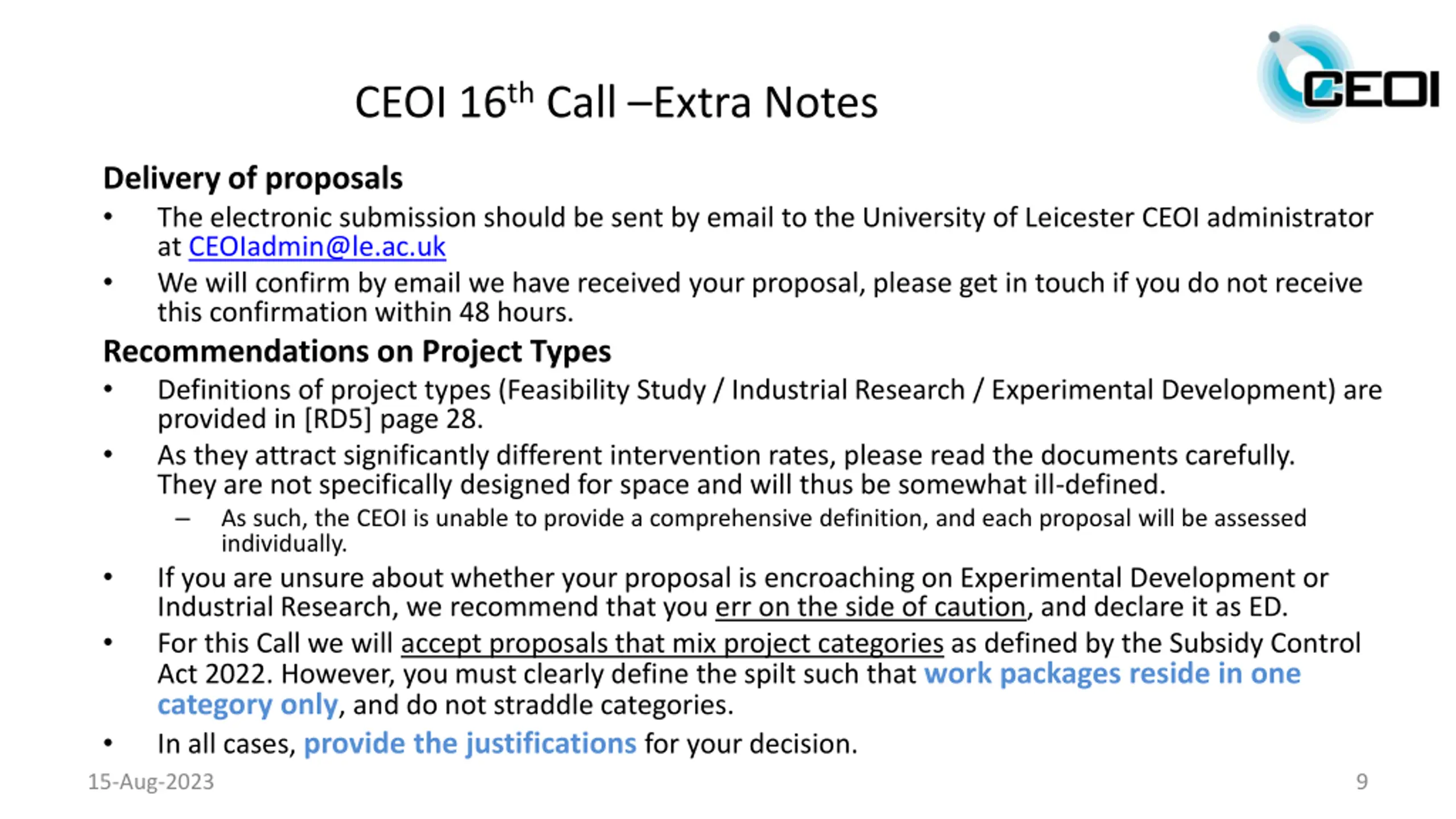 CEOI 16th Call Extra Notes Delivery of proposals The electronic submission should be sent by email to the University of Leicester CEOI administrator at CEOIadmin@le.ac.uk We will confirm by email we have received your proposal, please get in touch if you do not receive this confirmation within 48 hours. Recommendations on Project Types Definitions of project types (Feasibility Study / Industrial Research / Experimental Development) are provided in [RD5] page 28. As they attract significantly different intervention rates, please read the documents carefully. They are not specifically designed for space and will thus be somewhat ill-defined. As such, the CEOI is unable to provide a comprehensive definition, and each proposal will be assessed individually. If you are unsure about whether your proposal is encroaching on Experimental Development or Industrial Research, we recommend that you err on the side of caution, and declare it as ED. For this Call we will accept proposals that mix project categories as defined by the Subsidy Control Act 2022. However, you must clearly define the spilt such that work packages reside in one category only, and do not straddle categories. In all cases, provide the justifications for your decision. 15-Aug-2023 9