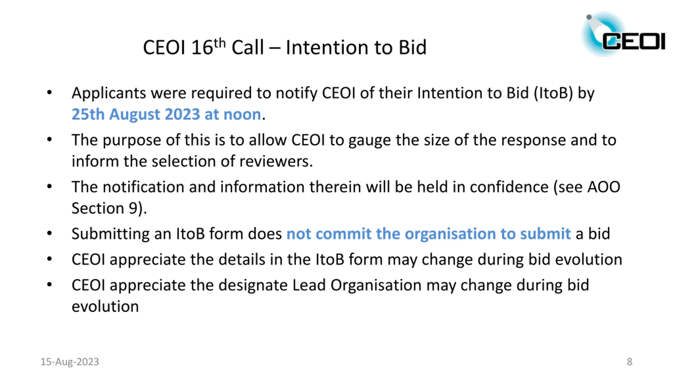 CEOI 16th Call Intention to Bid Applicants were required to notify CEOI of their Intention to Bid (ItoB) by 25th August 2023 at noon. The purpose of this is to allow CEOI to gauge the size of the response and to inform the selection of reviewers. The notification and information therein will be held in confidence (see AOO Section 9). Submitting an ItoB form does not commit the organisation to submit a bid CEOI appreciate the details in the ItoB form may change during bid evolution CEOI appreciate the designate Lead Organisation may change during bid evolution 15-Aug-2023 8