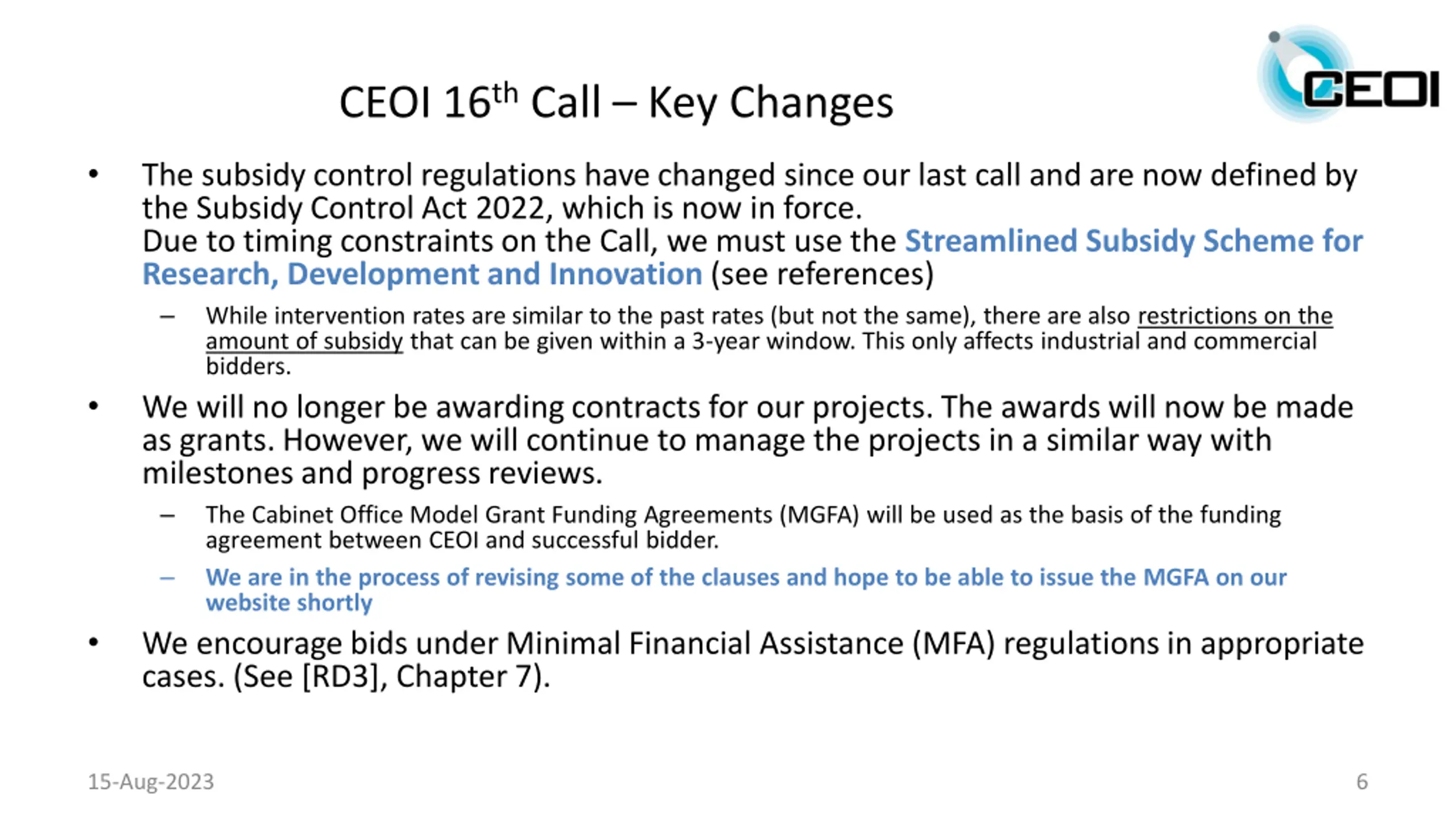 CEOI 16th Call Key Changes The subsidy control regulations have changed since our last call and are now defined by the Subsidy Control Act 2022, which is now in force. Due to timing constraints on the Call, we must use the Streamlined Subsidy Scheme for Research, Development and Innovation (see references) While intervention rates are similar to the past rates (but not the same), there are also restrictions on the amount of subsidy that can be given within a 3-year window. This only affects industrial and commercial bidders. We will no longer be awarding contracts for our projects. The awards will now be made as grants. However, we will continue to manage the projects in a similar way with milestones and progress reviews. The Cabinet Office Model Grant Funding Agreements (MGFA) will be used as the basis of the funding agreement between CEOI and successful bidder. We are in the process of revising some of the clauses and hope to be able to issue the MGFA on our website shortly We encourage bids under Minimal Financial Assistance (MFA) regulations in appropriate cases. (See [RD3], Chapter 7). 15-Aug-2023 6
