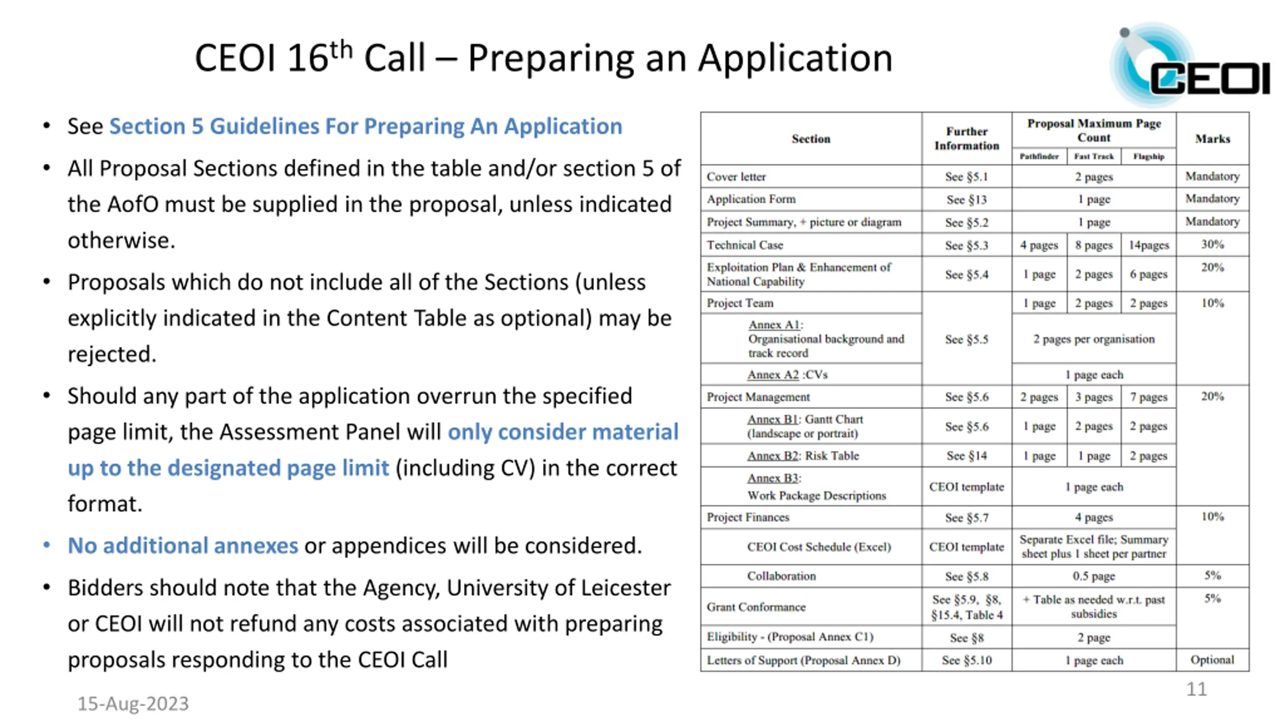 CEOI 16th Call Preparing an Application See Section 5 Guidelines For Preparing An Application All Proposal Sections defined in the table and/or section 5 of the AofO must be supplied in the proposal, unless indicated otherwise. Proposals which do not include all of the Sections (unless explicitly indicated in the Content Table as optional) may be rejected. Should any part of the application overrun the specified page limit, the Assessment Panel will only consider material up to the designated page limit (including CV) in the correct format. No additional annexes or appendices will be considered. Bidders should note that the Agency, University of Leicester or CEOI will not refund any costs associated with preparing proposals responding to the CEOI Call 11 15-Aug-2023