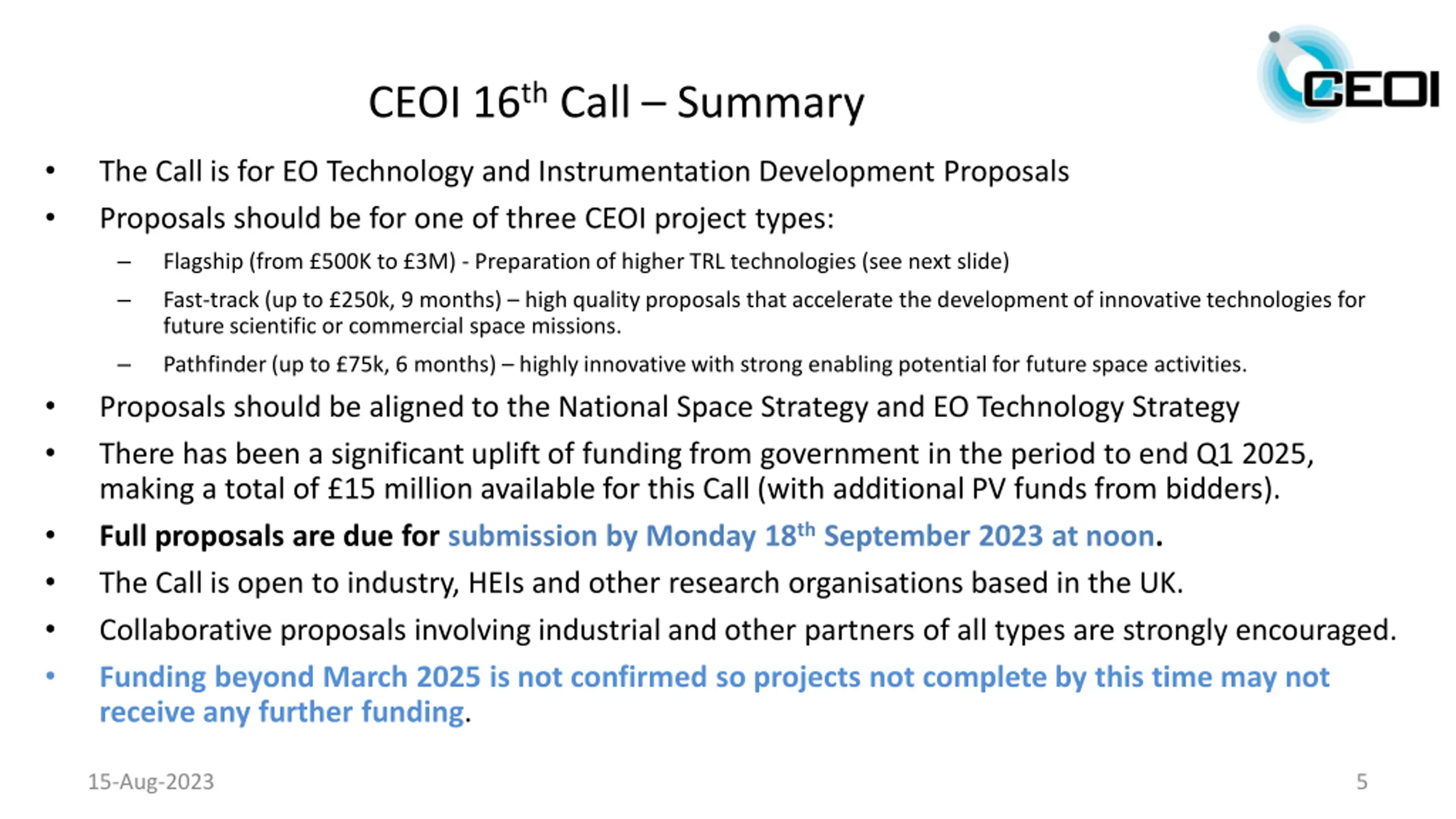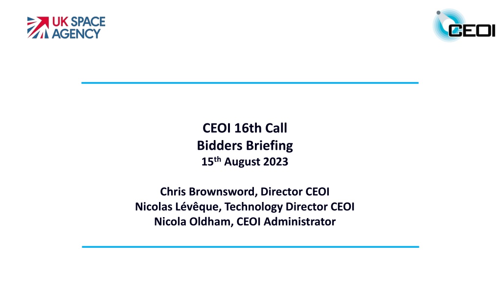 CEOI 16th Call Bidders Briefing 15thAugust 2023 Chris Brownsword, Director CEOI Nicolas L v que, Technology Director CEOI Nicola Oldham, CEOI Administrator