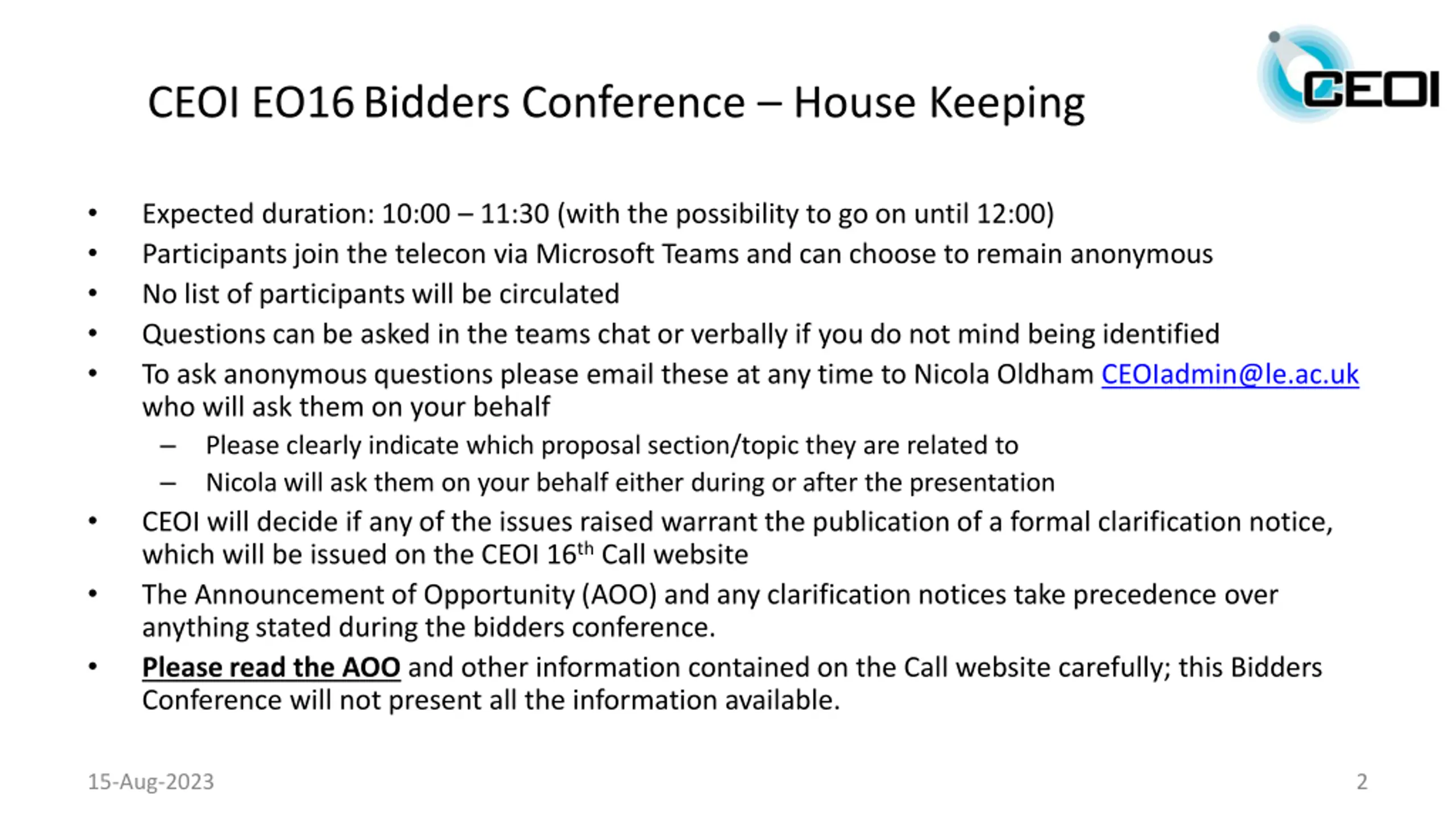 CEOI EO16Bidders Conference House Keeping Expected duration: 10:00 11:30 (with the possibility to go on until 12:00) Participants join the telecon via Microsoft Teams and can choose to remain anonymous No list of participants will be circulated Questions can be asked in the teams chat or verbally if you do not mind being identified To ask anonymous questions please email these at any time to Nicola Oldham CEOIadmin@le.ac.uk who will ask them on your behalf Please clearly indicate which proposal section/topic they are related to Nicola will ask them on your behalf either during or after the presentation CEOI will decide if any of the issues raised warrant the publication of a formal clarification notice, which will be issued on the CEOI 16th Call website The Announcement of Opportunity (AOO) and any clarification notices take precedence over anything stated during the bidders conference. Please read the AOO and other information contained on the Call website carefully; this Bidders Conference will not present all the information available. 15-Aug-2023 2