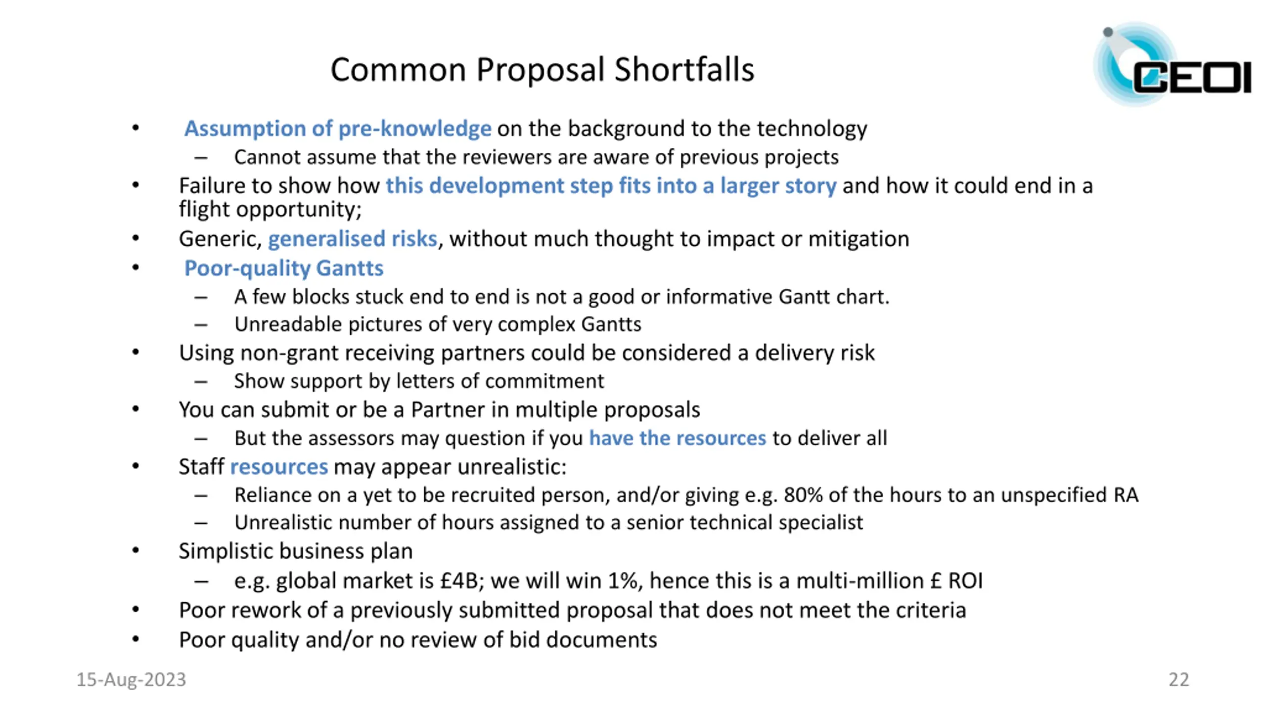 Common Proposal Shortfalls Assumption of pre-knowledge on the background to the technology Cannot assume that the reviewers are aware of previous projects Failure to show how this development step fits into a larger story and how it could end in a flight opportunity; Generic, generalised risks, without much thought to impact or mitigation Poor-quality Gantts A few blocks stuck end to end is not a good or informative Gantt chart. Unreadable pictures of very complex Gantts Using non-grant receiving partners could be considered a delivery risk Show support by letters of commitment You can submit or be a Partner in multiple proposals But the assessors may question if you have the resources to deliver all Staff resources may appear unrealistic: Reliance on a yet to be recruited person, and/or giving e.g. 80% of the hours to an unspecified RA Unrealistic number of hours assigned to a senior technical specialist Simplistic business plan e.g. global market is 4B; we will win 1%, hence this is a multi-million ROI Poor rework of a previously submitted proposal that does not meet the criteria Poor quality and/or no review of bid documents 15-Aug-2023 22