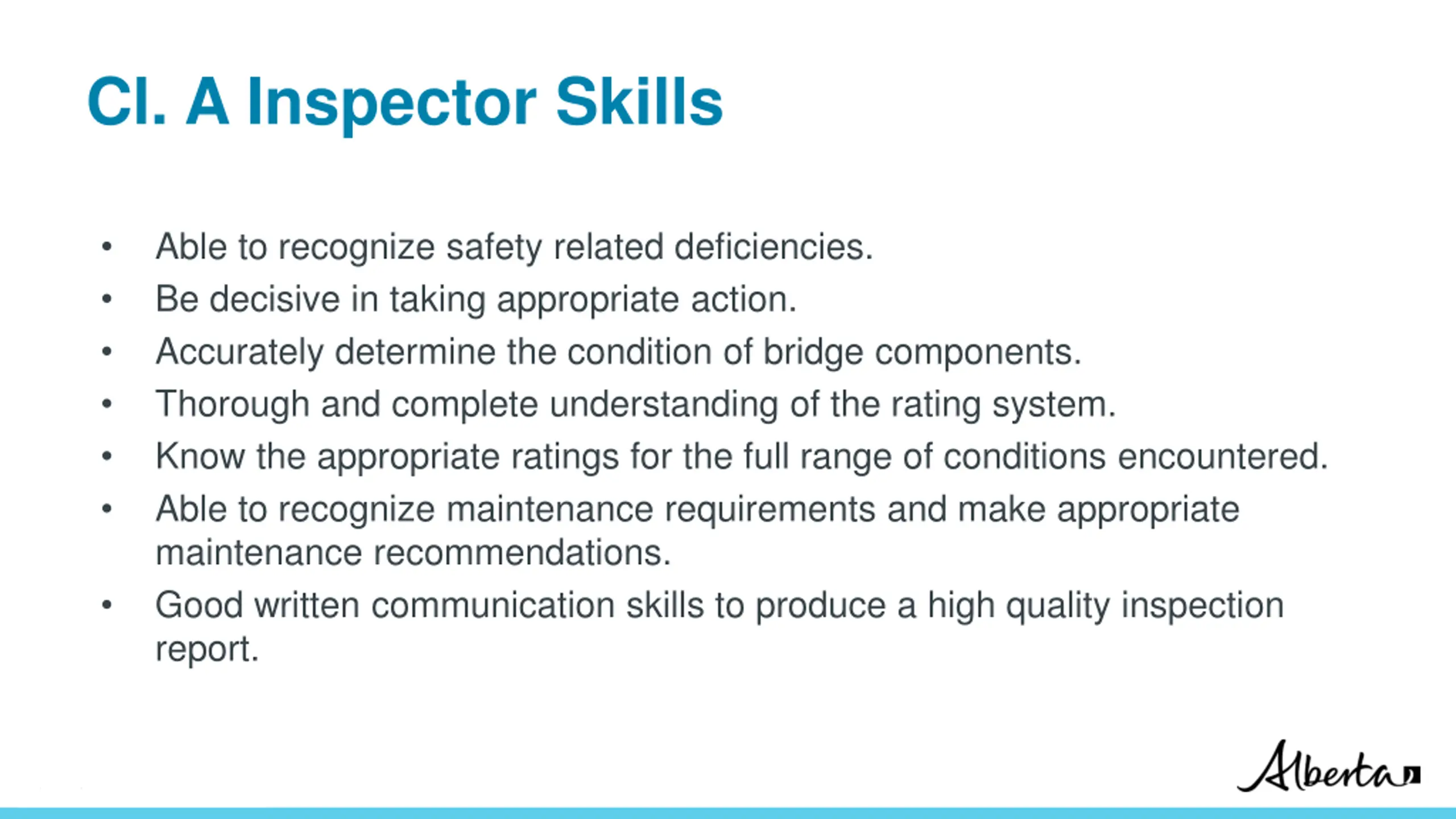 Cl. A Inspector Skills Able to recognize safety related deficiencies. Be decisive in taking appropriate action. Accurately determine the condition of bridge components. Thorough and complete understanding of the rating system. Know the appropriate ratings for the full range of conditions encountered. Able to recognize maintenance requirements and make appropriate maintenance recommendations. Good written communication skills to produce a high quality inspection report. Classification: Protected A