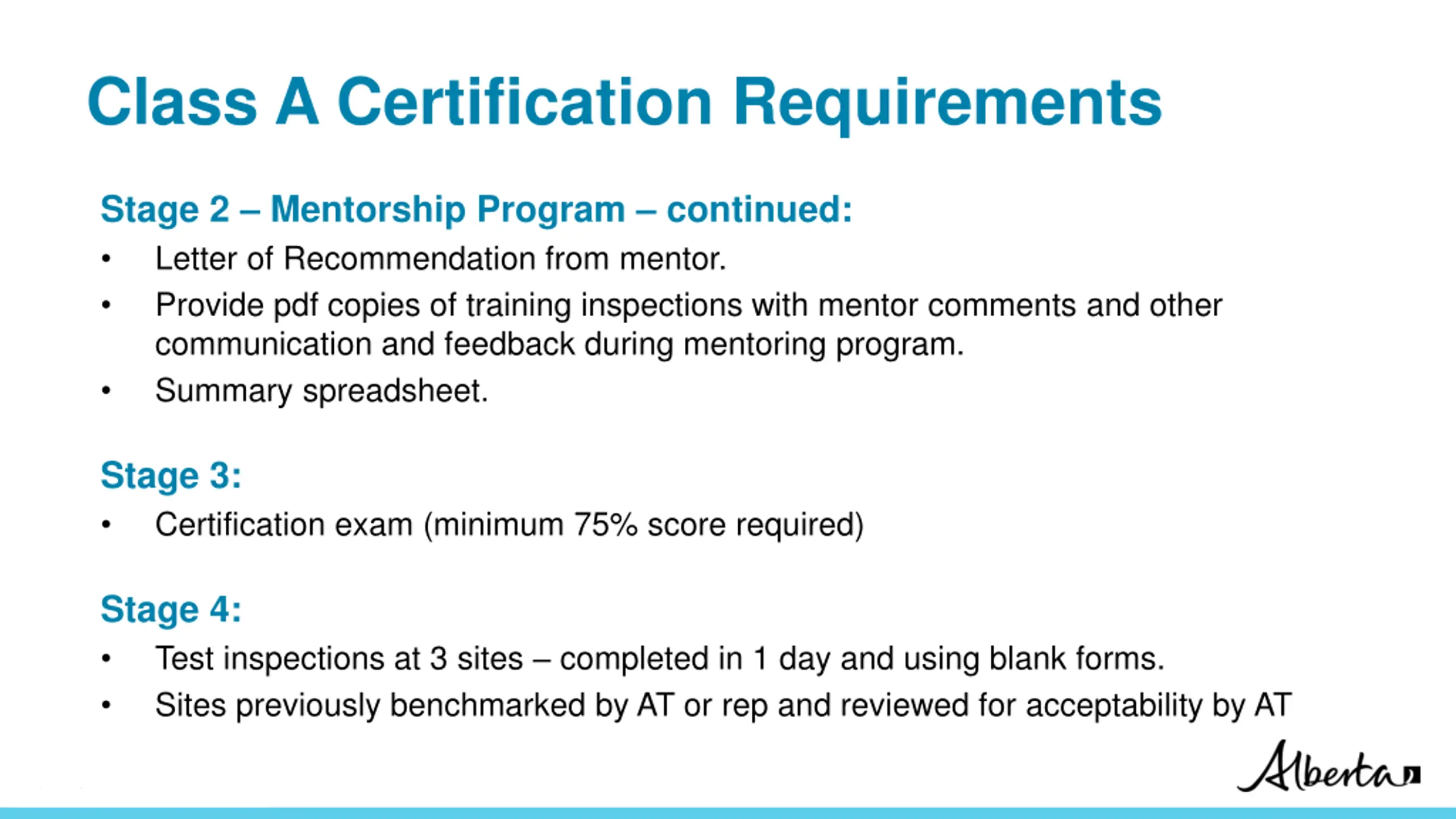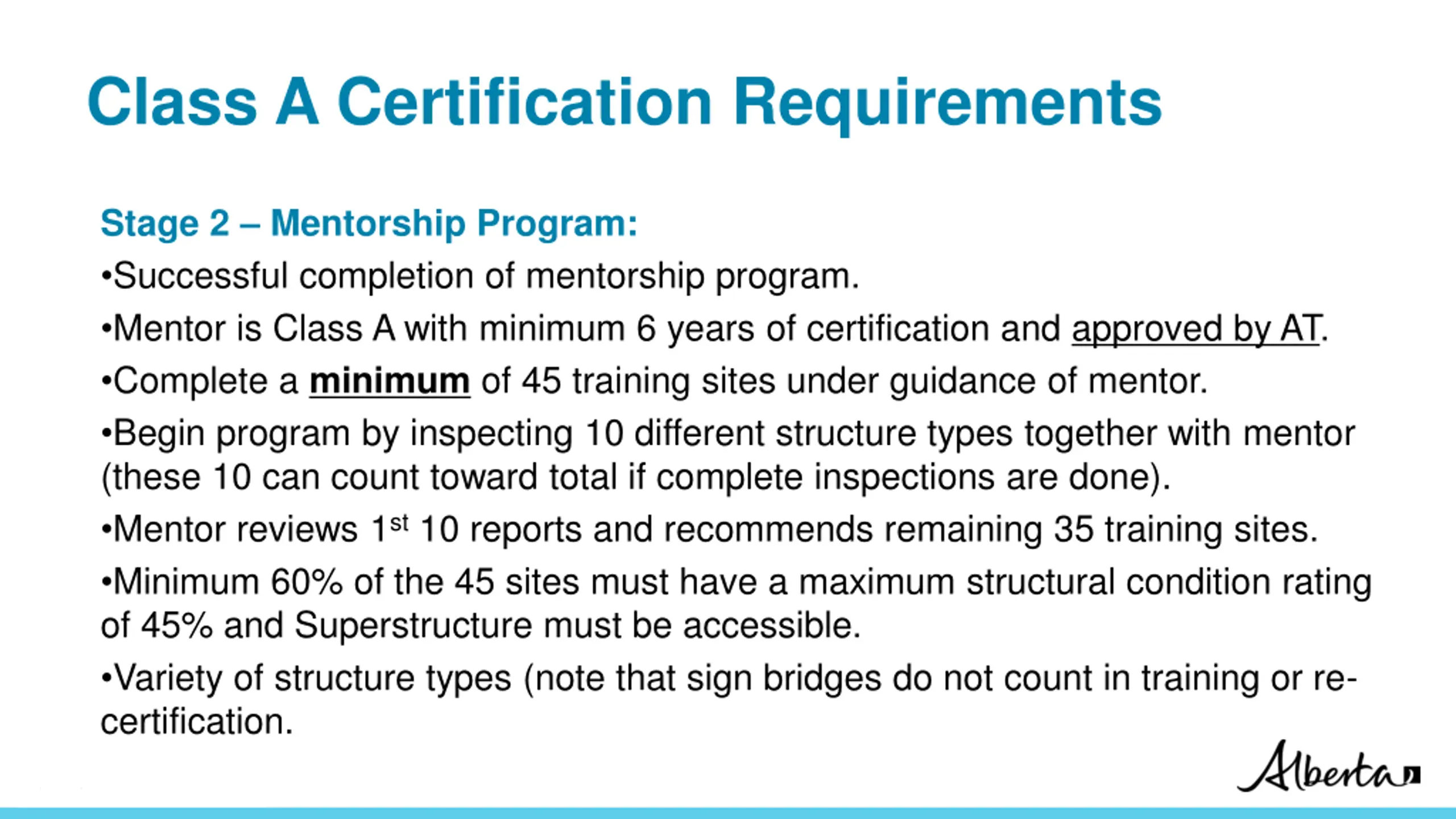 Class A Certification Requirements Stage 2 Mentorship Program: Successful completion of mentorship program. Mentor is Class A with minimum 6 years of certification and approved by AT. Complete a minimum of 45 training sites under guidance of mentor. Begin program by inspecting 10 different structure types together with mentor (these 10 can count toward total if complete inspections are done). Mentor reviews 1st10 reports and recommends remaining 35 training sites. Minimum 60% of the 45 sites must have a maximum structural condition rating of 45% and Superstructure must be accessible. Variety of structure types (note that sign bridges do not count in training or re- certification. Classification: Protected A