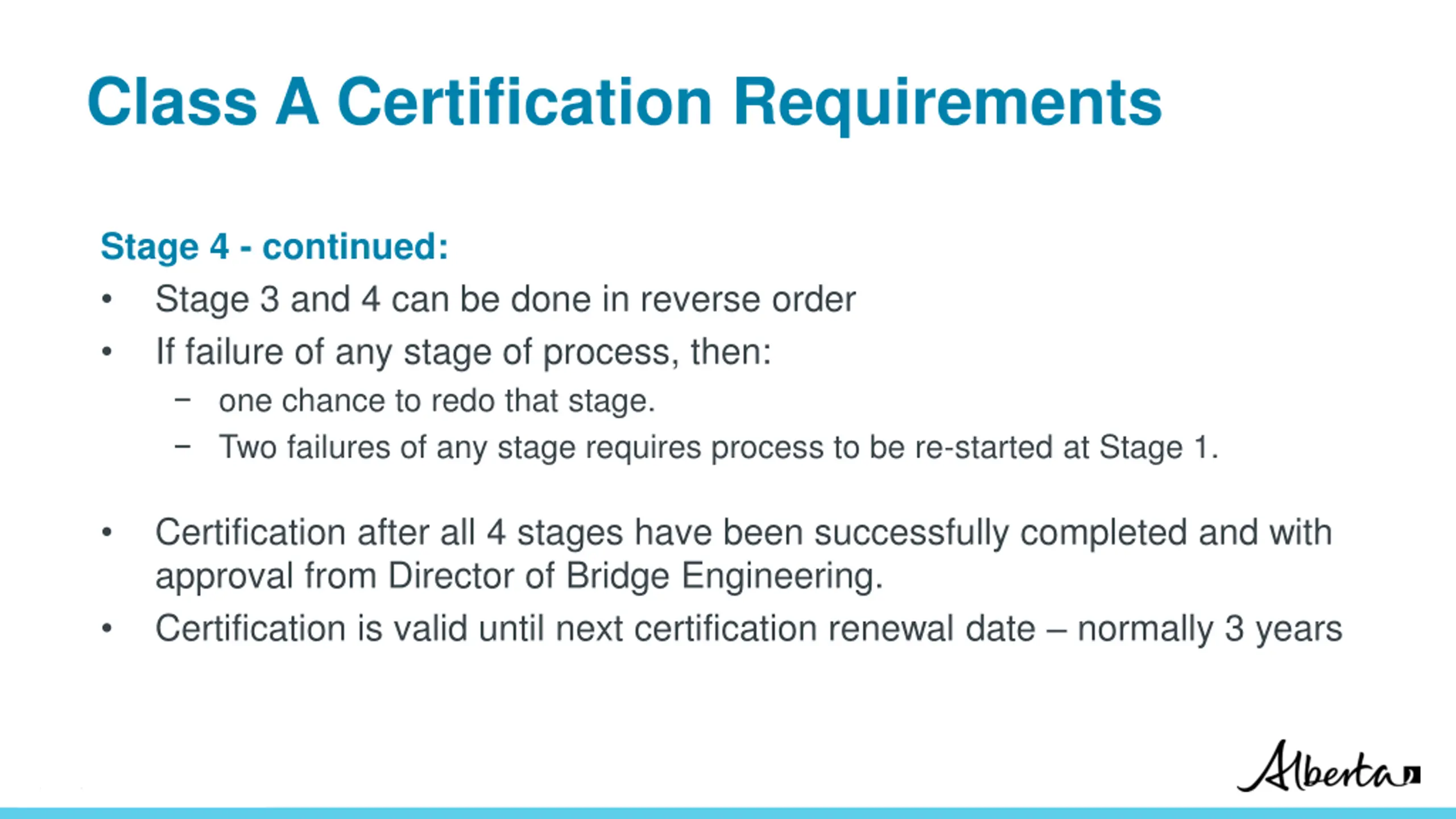 Class A Certification Requirements Stage 4 - continued: Stage 3 and 4 can be done in reverse order If failure of any stage of process, then: one chance to redo that stage. Two failures of any stage requires process to be re-started at Stage 1. Certification after all 4 stages have been successfully completed and with approval from Director of Bridge Engineering. Certification is valid until next certification renewal date normally 3 years Classification: Protected A