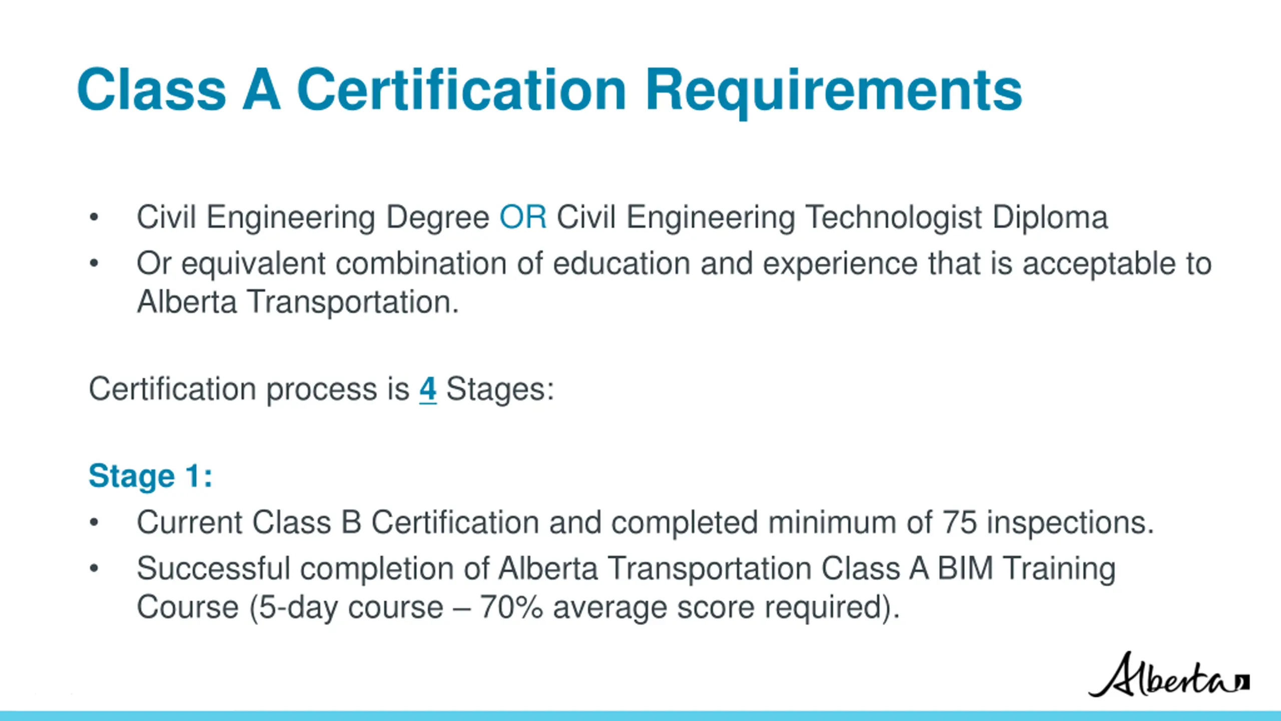 Class A Certification Requirements Civil Engineering Degree OR Civil Engineering Technologist Diploma Or equivalent combination of education and experience that is acceptable to Alberta Transportation. Certification process is 4 Stages: Stage 1: Current Class B Certification and completed minimum of 75 inspections. Successful completion of Alberta Transportation Class A BIM Training Course (5-day course 70% average score required). Classification: Protected A