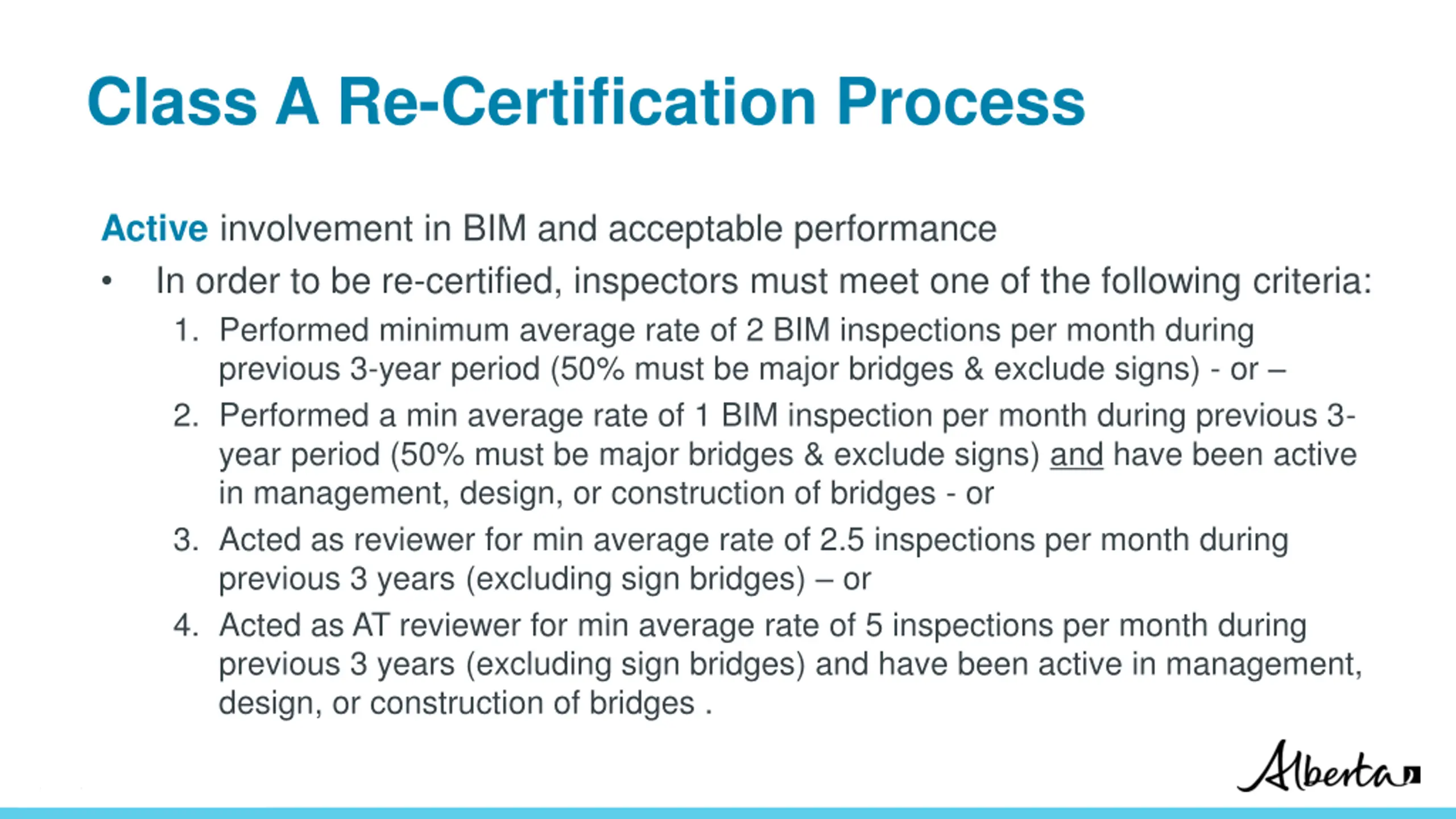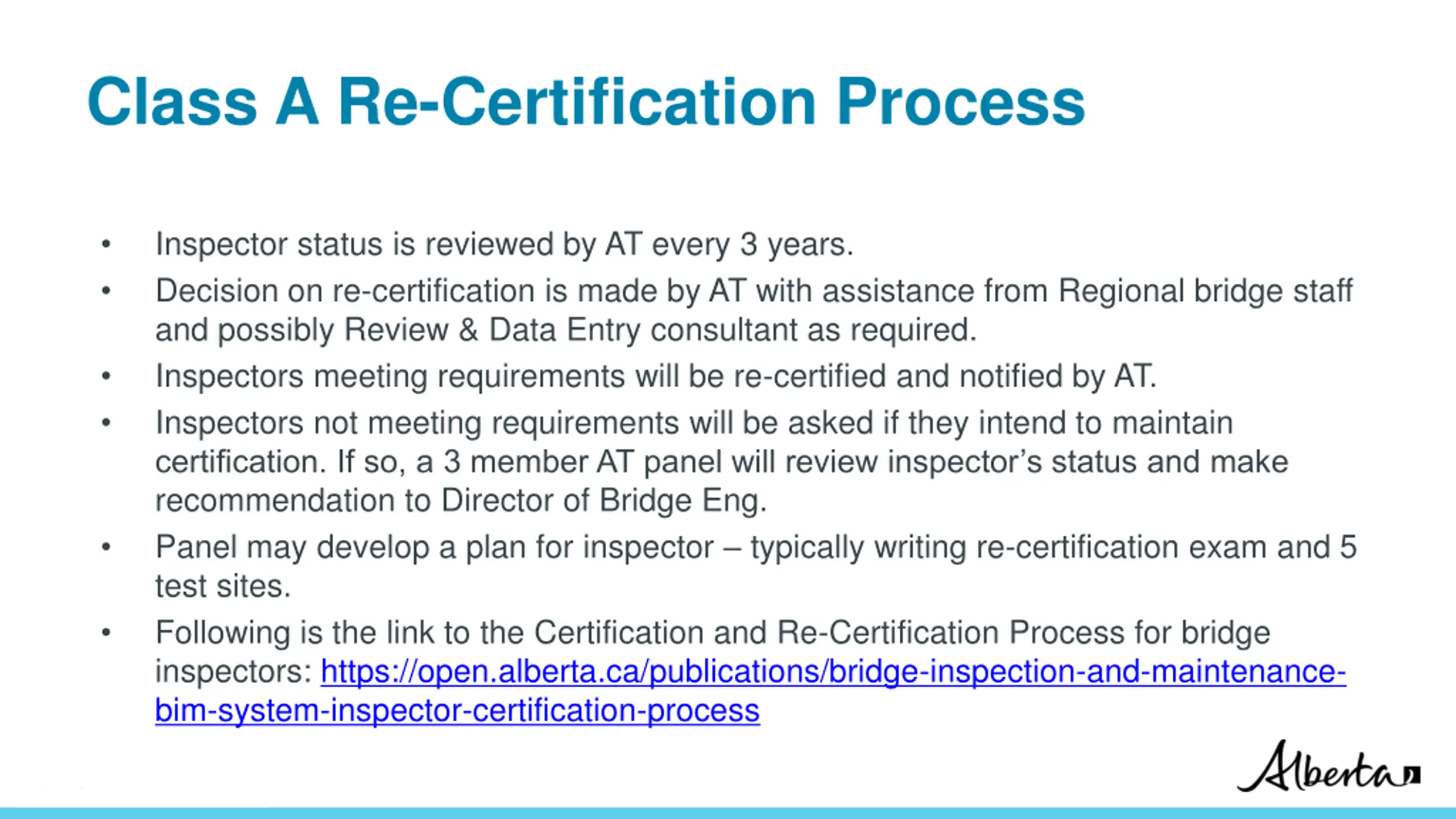 Class A Re-Certification Process Inspector status is reviewed by AT every 3 years. Decision on re-certification is made by AT with assistance from Regional bridge staff and possibly Review & Data Entry consultant as required. Inspectors meeting requirements will be re-certified and notified by AT. Inspectors not meeting requirements will be asked if they intend to maintain certification. If so, a 3 member AT panel will review inspector s status and make recommendation to Director of Bridge Eng. Panel may develop a plan for inspector typically writing re-certification exam and 5 test sites. Following is the link to the Certification and Re-Certification Process for bridge inspectors: https://open.alberta.ca/publications/bridge-inspection-and-maintenance- bim-system-inspector-certification-process Classification: Protected A
