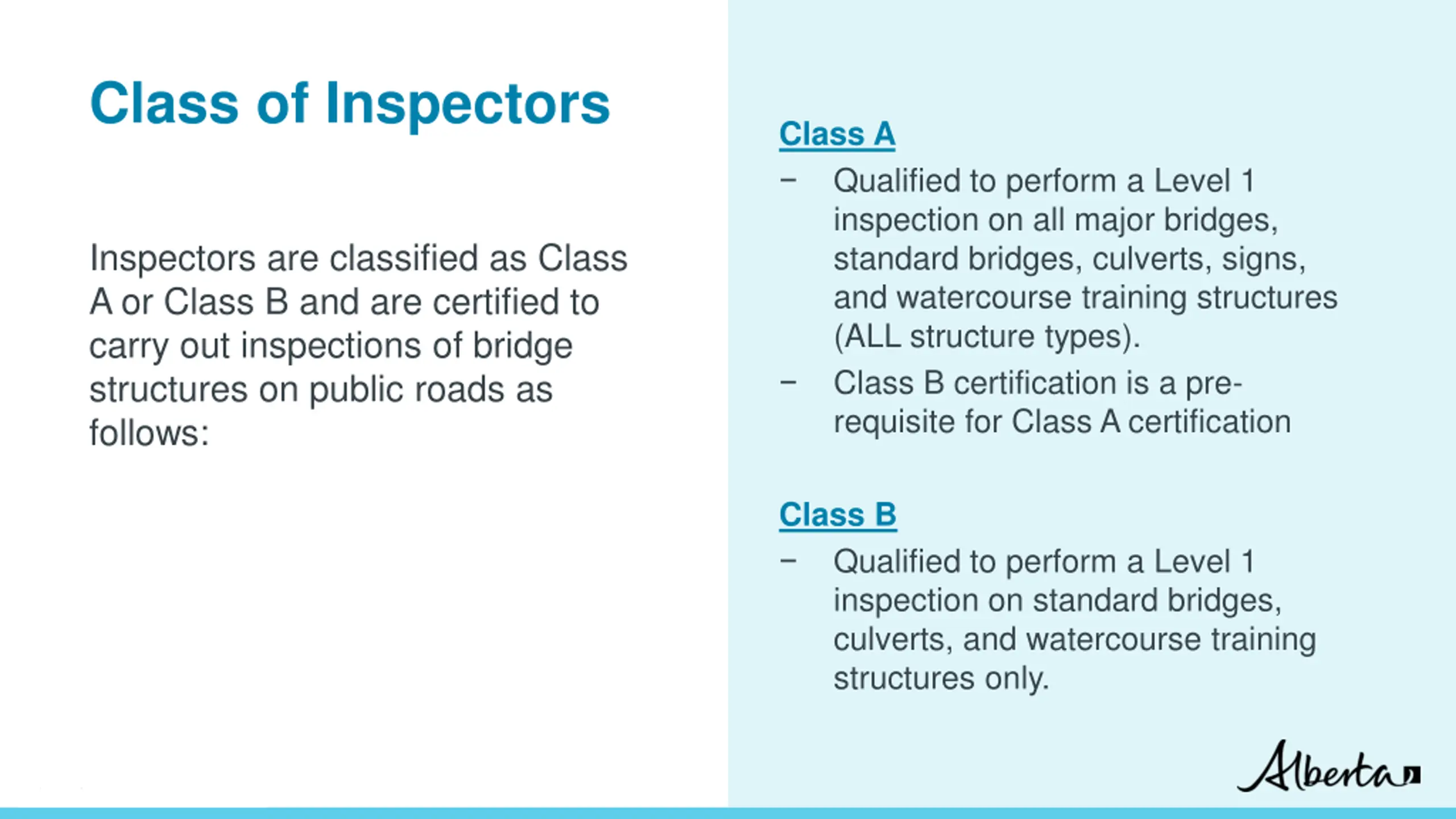 Class of Inspectors Class A Qualified to perform a Level 1 inspection on all major bridges, standard bridges, culverts, signs, and watercourse training structures (ALL structure types). Class B certification is a pre- requisite for Class A certification Inspectors are classified as Class A or Class B and are certified to carry out inspections of bridge structures on public roads as follows: Class B Qualified to perform a Level 1 inspection on standard bridges, culverts, and watercourse training structures only. Classification: Protected A