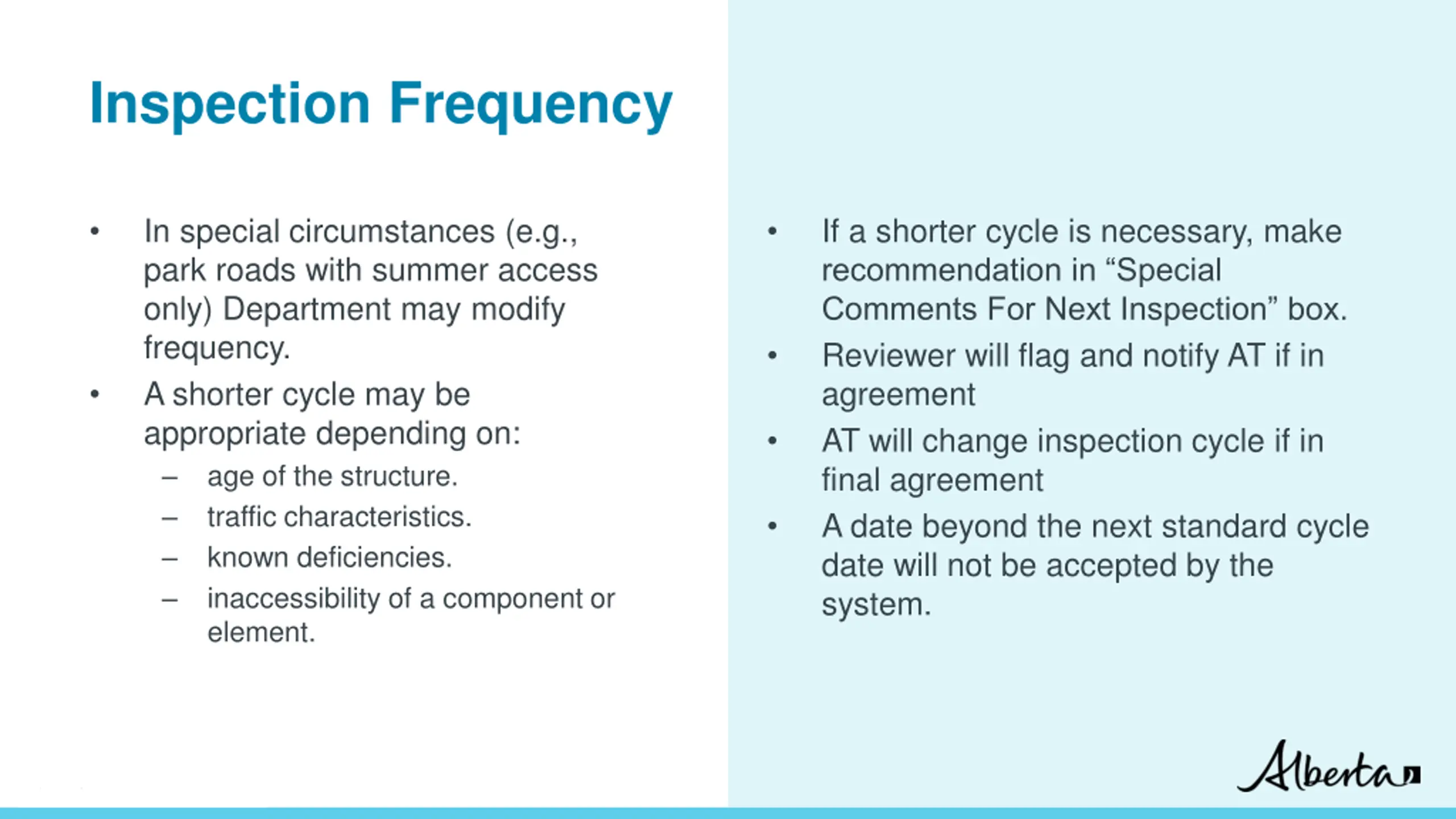 Inspection Frequency In special circumstances (e.g., park roads with summer access only) Department may modify frequency. A shorter cycle may be appropriate depending on: age of the structure. traffic characteristics. known deficiencies. inaccessibility of a component or element. If a shorter cycle is necessary, make recommendation in Special Comments For Next Inspection box. Reviewer will flag and notify AT if in agreement AT will change inspection cycle if in final agreement A date beyond the next standard cycle date will not be accepted by the system. Classification: Protected A