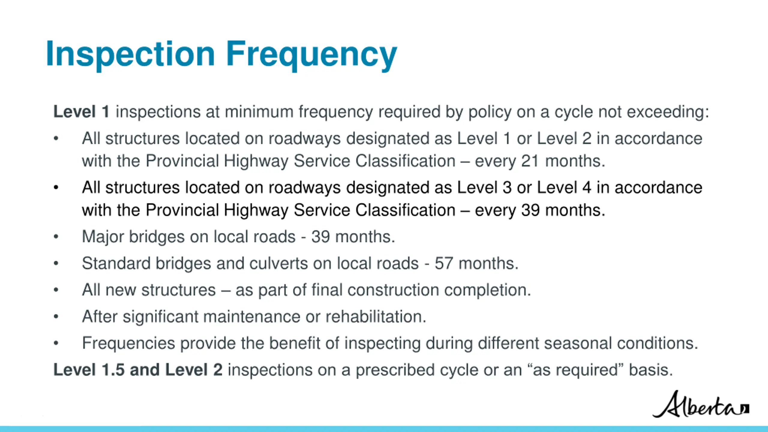 Inspection Frequency Level 1 inspections at minimum frequency required by policy on a cycle not exceeding: All structures located on roadways designated as Level 1 or Level 2 in accordance with the Provincial Highway Service Classification every 21 months. All structures located on roadways designated as Level 3 or Level 4 in accordance with the Provincial Highway Service Classification every 39 months. Major bridges on local roads - 39 months. Standard bridges and culverts on local roads - 57 months. All new structures as part of final construction completion. After significant maintenance or rehabilitation. Frequencies provide the benefit of inspecting during different seasonal conditions. Level 1.5 and Level 2 inspections on a prescribed cycle or an as required basis. Classification: Protected A