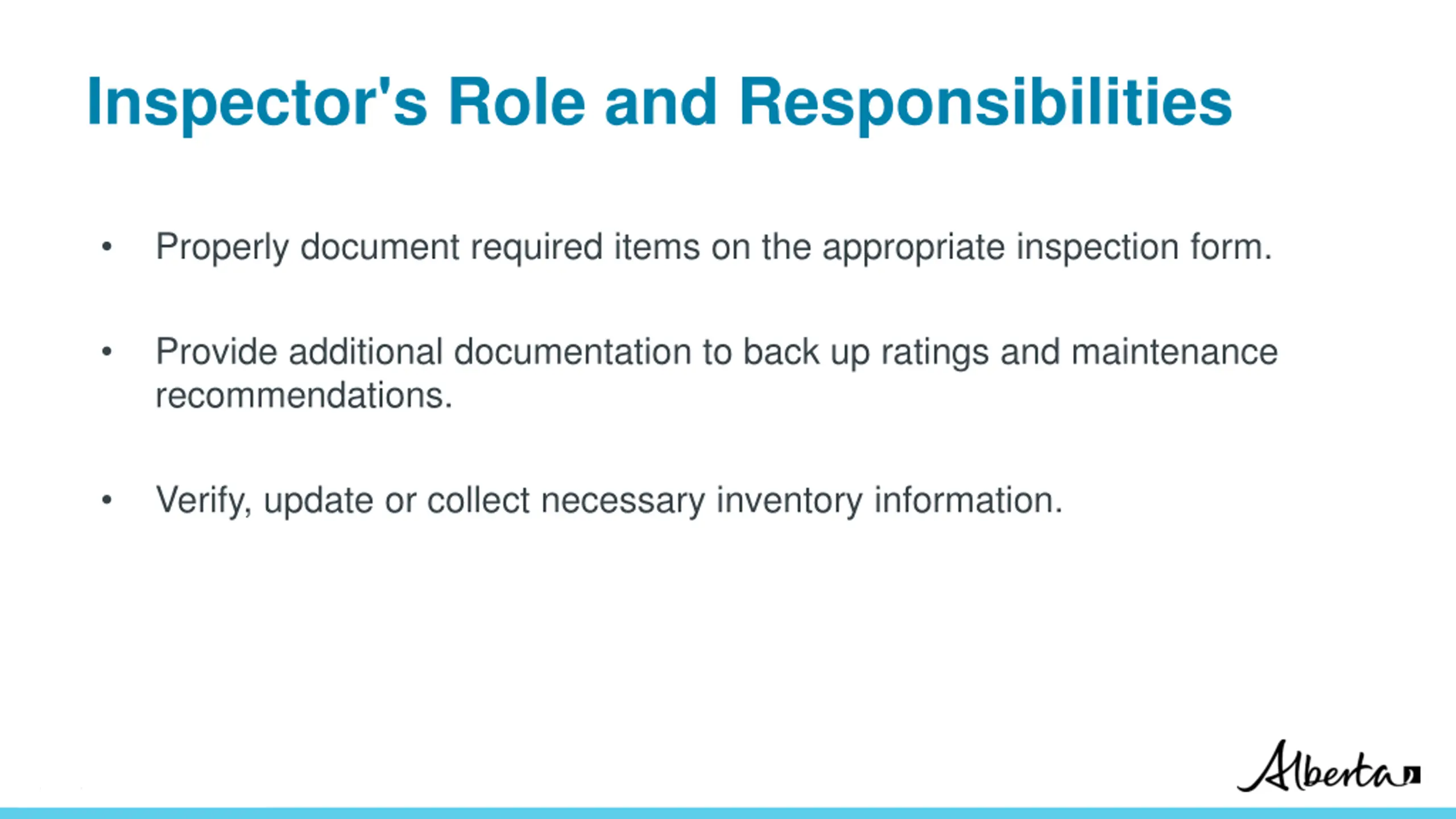 Inspector's Role and Responsibilities Properly document required items on the appropriate inspection form. Provide additional documentation to back up ratings and maintenance recommendations. Verify, update or collect necessary inventory information. Classification: Protected A