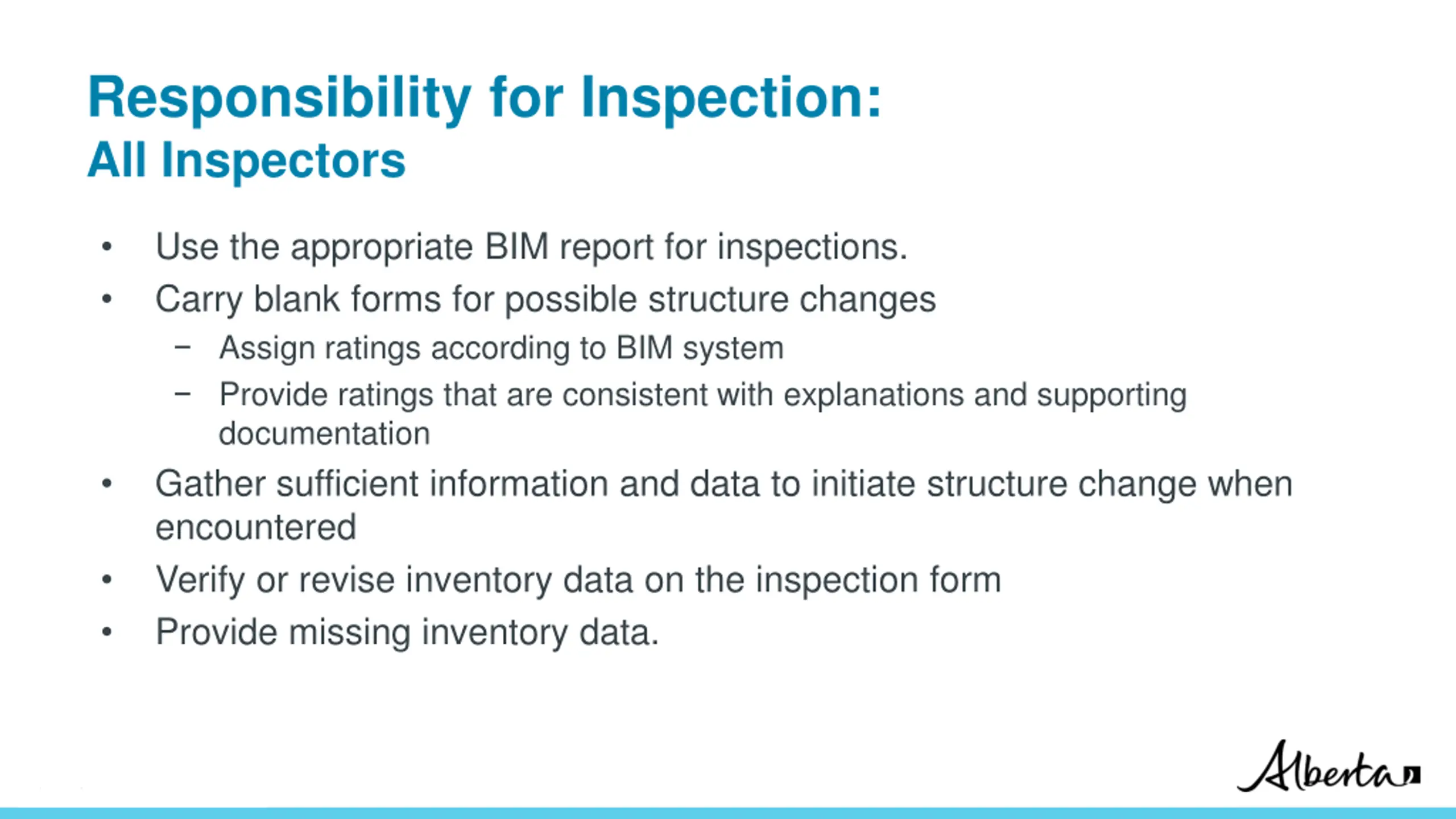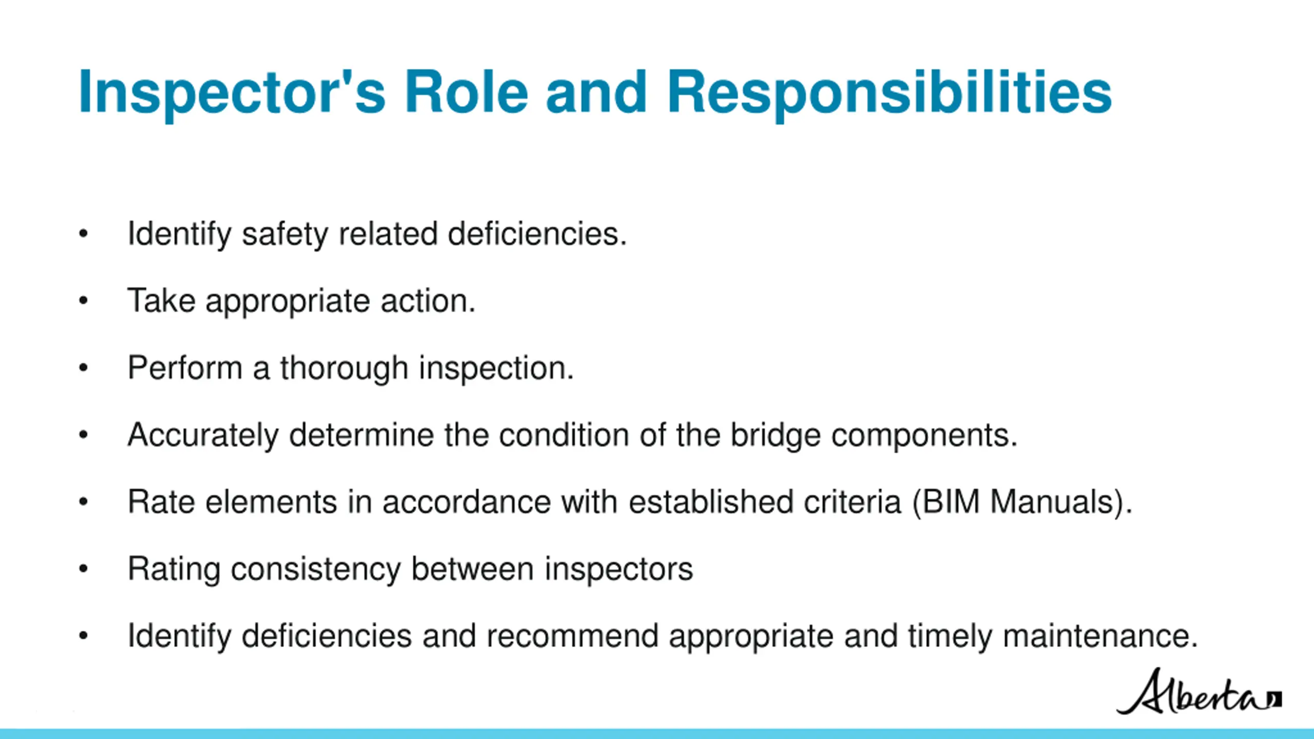 Inspector's Role and Responsibilities Identify safety related deficiencies. Take appropriate action. Perform a thorough inspection. Accurately determine the condition of the bridge components. Rate elements in accordance with established criteria (BIM Manuals). Rating consistency between inspectors Identify deficiencies and recommend appropriate and timely maintenance. Classification: Protected A
