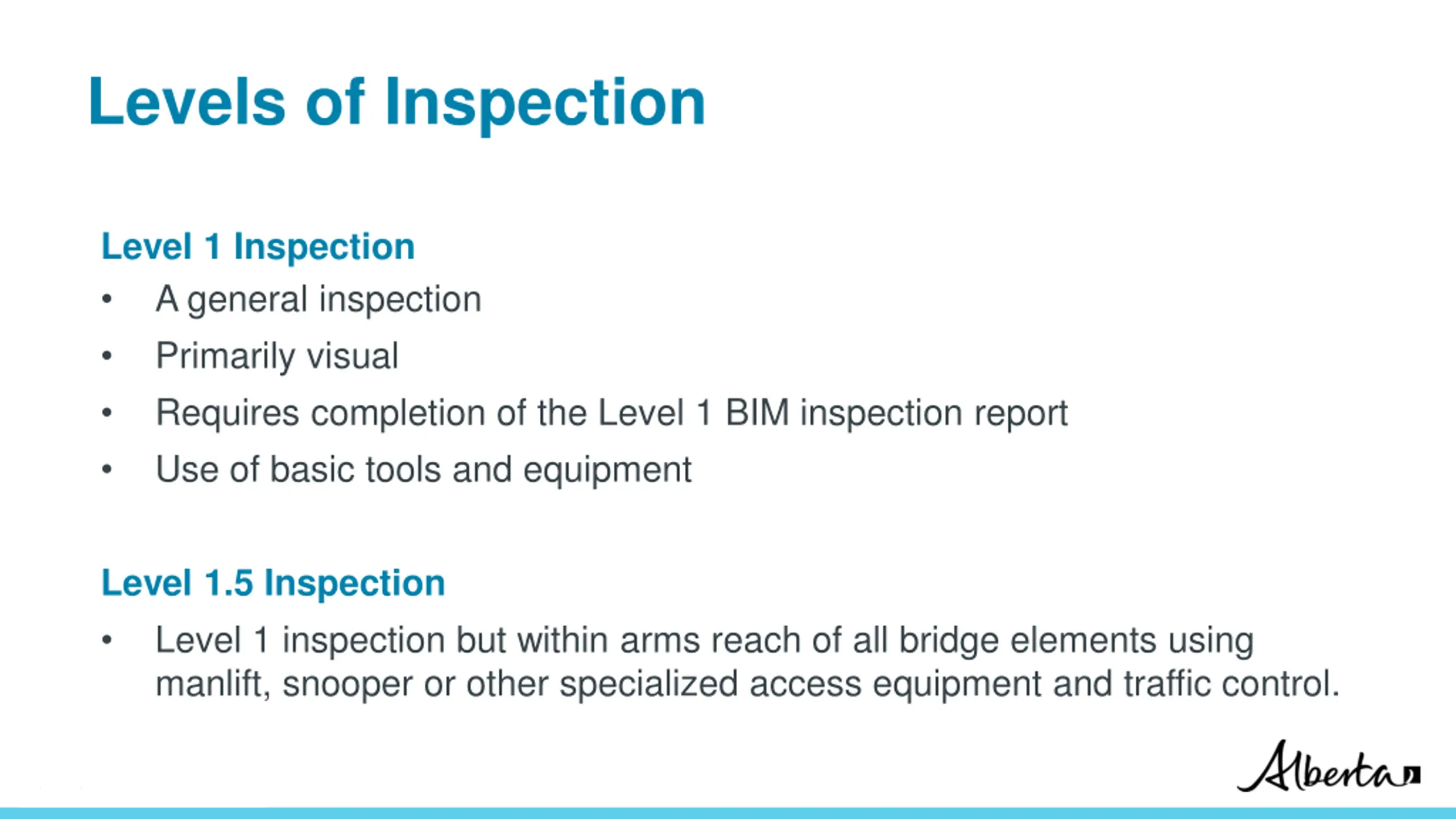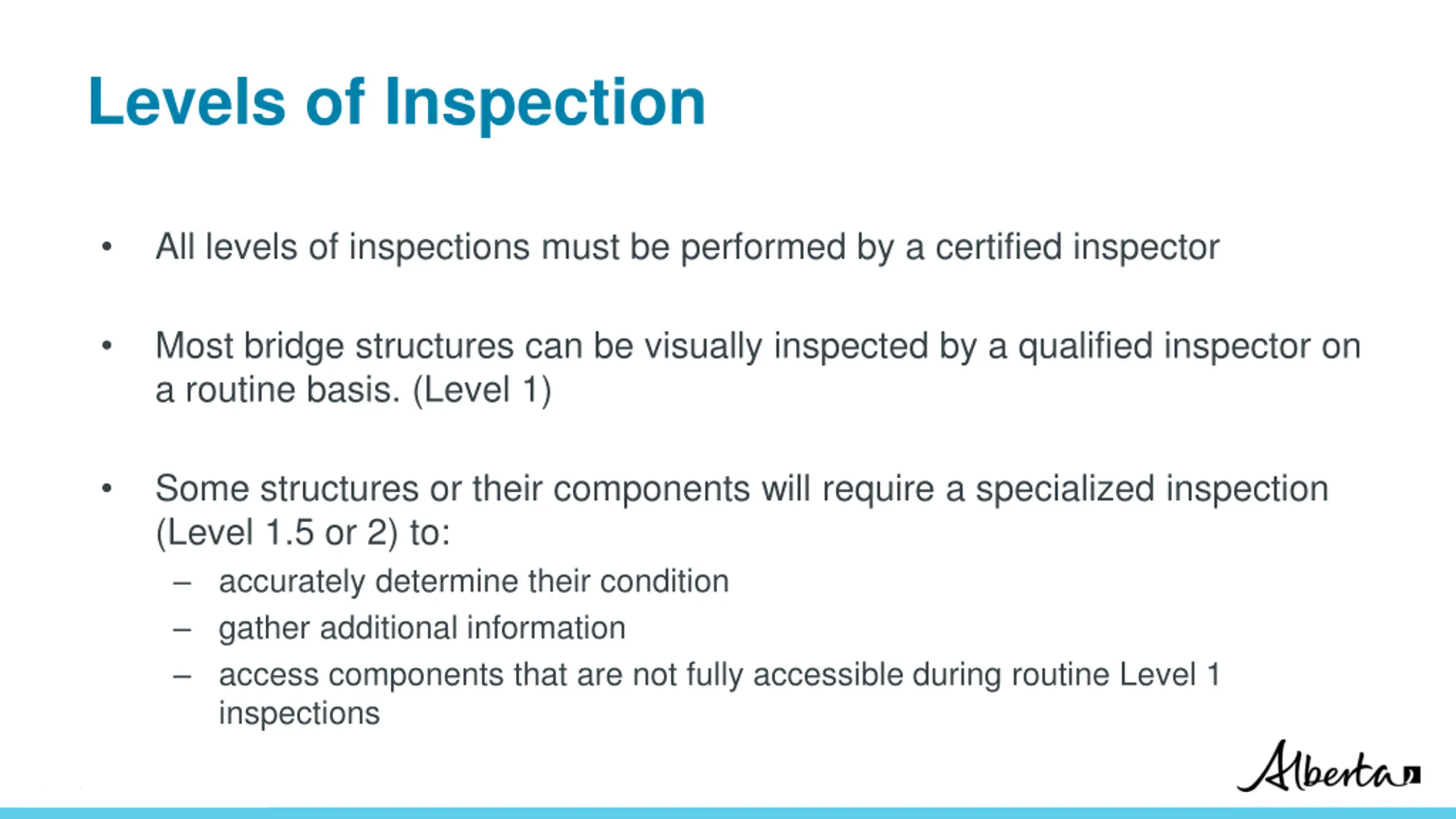 Levels of Inspection All levels of inspections must be performed by a certified inspector Most bridge structures can be visually inspected by a qualified inspector on a routine basis. (Level 1) Some structures or their components will require a specialized inspection (Level 1.5 or 2) to: accurately determine their condition gather additional information access components that are not fully accessible during routine Level 1 inspections Classification: Protected A