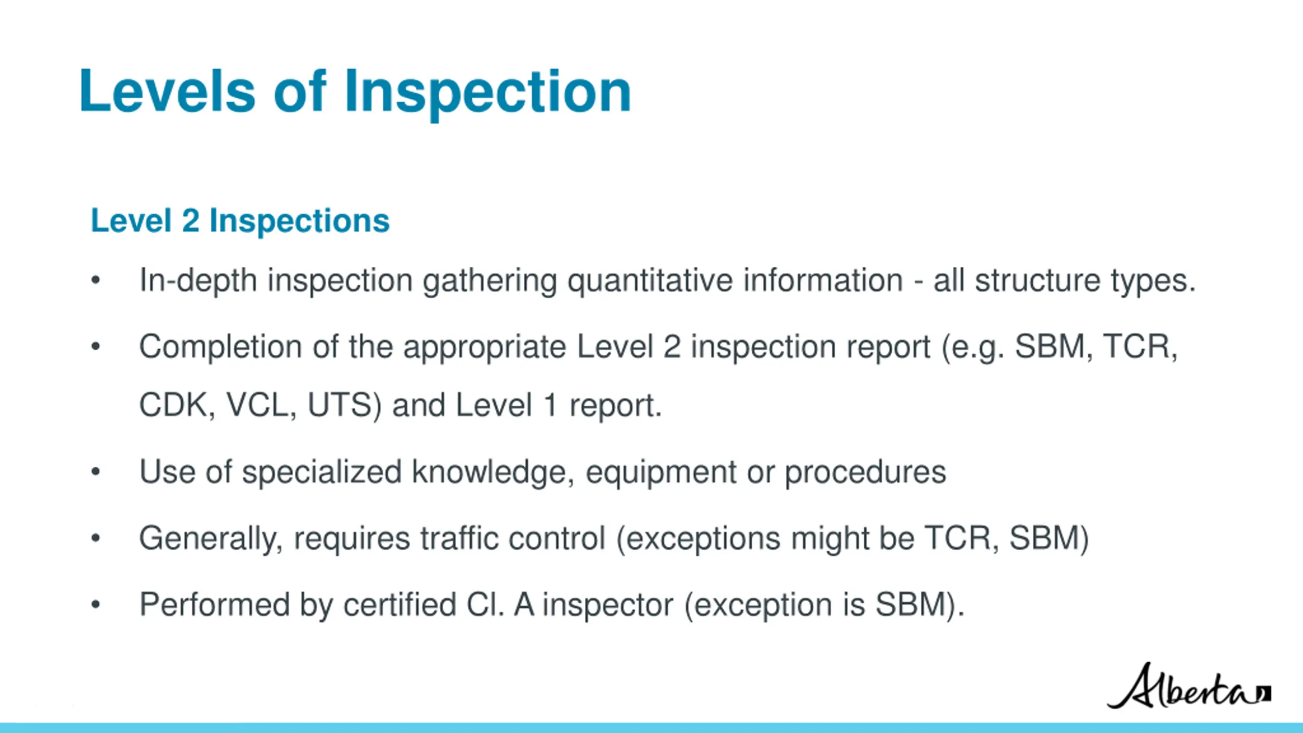 Levels of Inspection Level 2 Inspections In-depth inspection gathering quantitative information - all structure types. Completion of the appropriate Level 2 inspection report (e.g. SBM, TCR, CDK, VCL, UTS) and Level 1 report. Use of specialized knowledge, equipment or procedures Generally, requires traffic control (exceptions might be TCR, SBM) Performed by certified Cl. A inspector (exception is SBM). Classification: Protected A