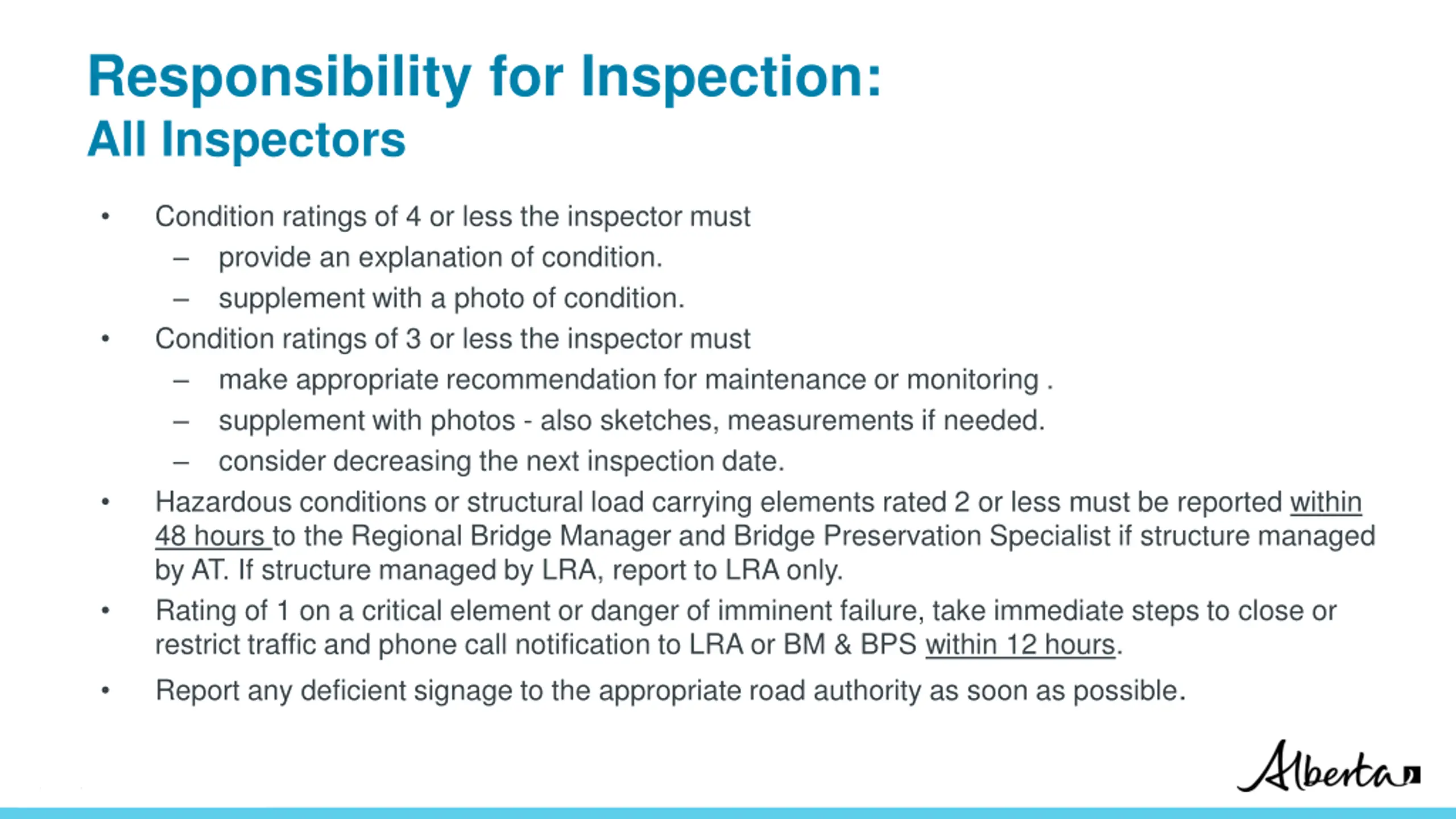 Responsibility for Inspection: All Inspectors Condition ratings of 4 or less the inspector must provide an explanation of condition. supplement with a photo of condition. Condition ratings of 3 or less the inspector must make appropriate recommendation for maintenance or monitoring . supplement with photos - also sketches, measurements if needed. consider decreasing the next inspection date. Hazardous conditions or structural load carrying elements rated 2 or less must be reported within 48 hours to the Regional Bridge Manager and Bridge Preservation Specialist if structure managed by AT. If structure managed by LRA, report to LRA only. Rating of 1 on a critical element or danger of imminent failure, take immediate steps to close or restrict traffic and phone call notification to LRA or BM & BPS within 12 hours. Report any deficient signage to the appropriate road authority as soon as possible. Classification: Protected A