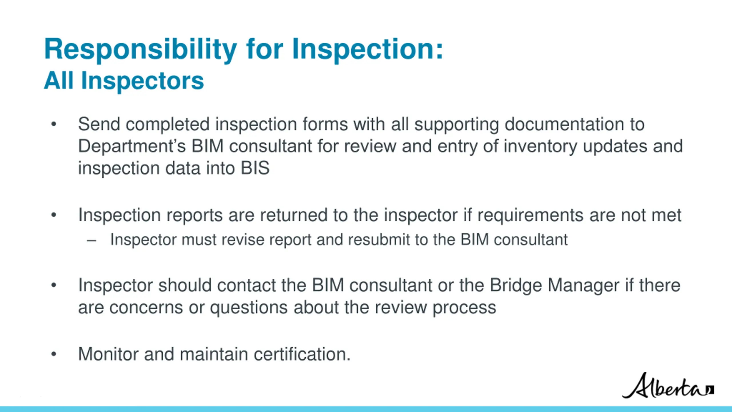 Responsibility for Inspection: All Inspectors Send completed inspection forms with all supporting documentation to Department s BIM consultant for review and entry of inventory updates and inspection data into BIS Inspection reports are returned to the inspector if requirements are not met Inspector must revise report and resubmit to the BIM consultant Inspector should contact the BIM consultant or the Bridge Manager if there are concerns or questions about the review process Monitor and maintain certification. Classification: Protected A
