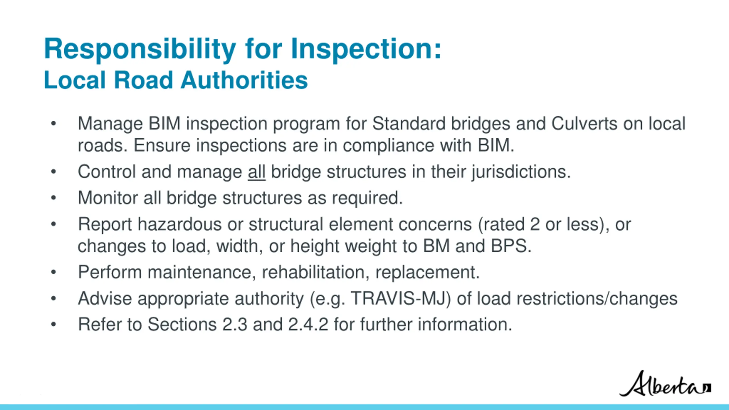 Responsibility for Inspection: Local Road Authorities Manage BIM inspection program for Standard bridges and Culverts on local roads. Ensure inspections are in compliance with BIM. Control and manage all bridge structures in their jurisdictions. Monitor all bridge structures as required. Report hazardous or structural element concerns (rated 2 or less), or changes to load, width, or height weight to BM and BPS. Perform maintenance, rehabilitation, replacement. Advise appropriate authority (e.g. TRAVIS-MJ) of load restrictions/changes Refer to Sections 2.3 and 2.4.2 for further information. Classification: Protected A