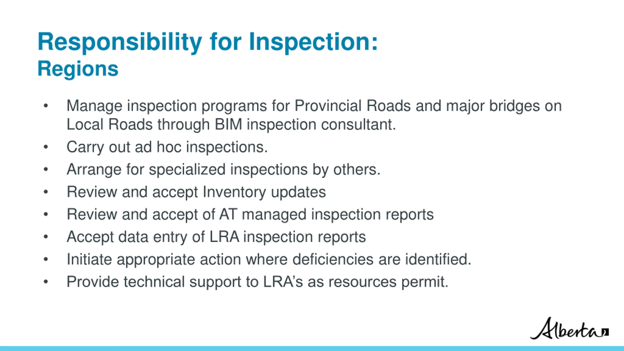 Responsibility for Inspection: Regions Manage inspection programs for Provincial Roads and major bridges on Local Roads through BIM inspection consultant. Carry out ad hoc inspections. Arrange for specialized inspections by others. Review and accept Inventory updates Review and accept of AT managed inspection reports Accept data entry of LRA inspection reports Initiate appropriate action where deficiencies are identified. Provide technical support to LRA s as resources permit. Classification: Protected A