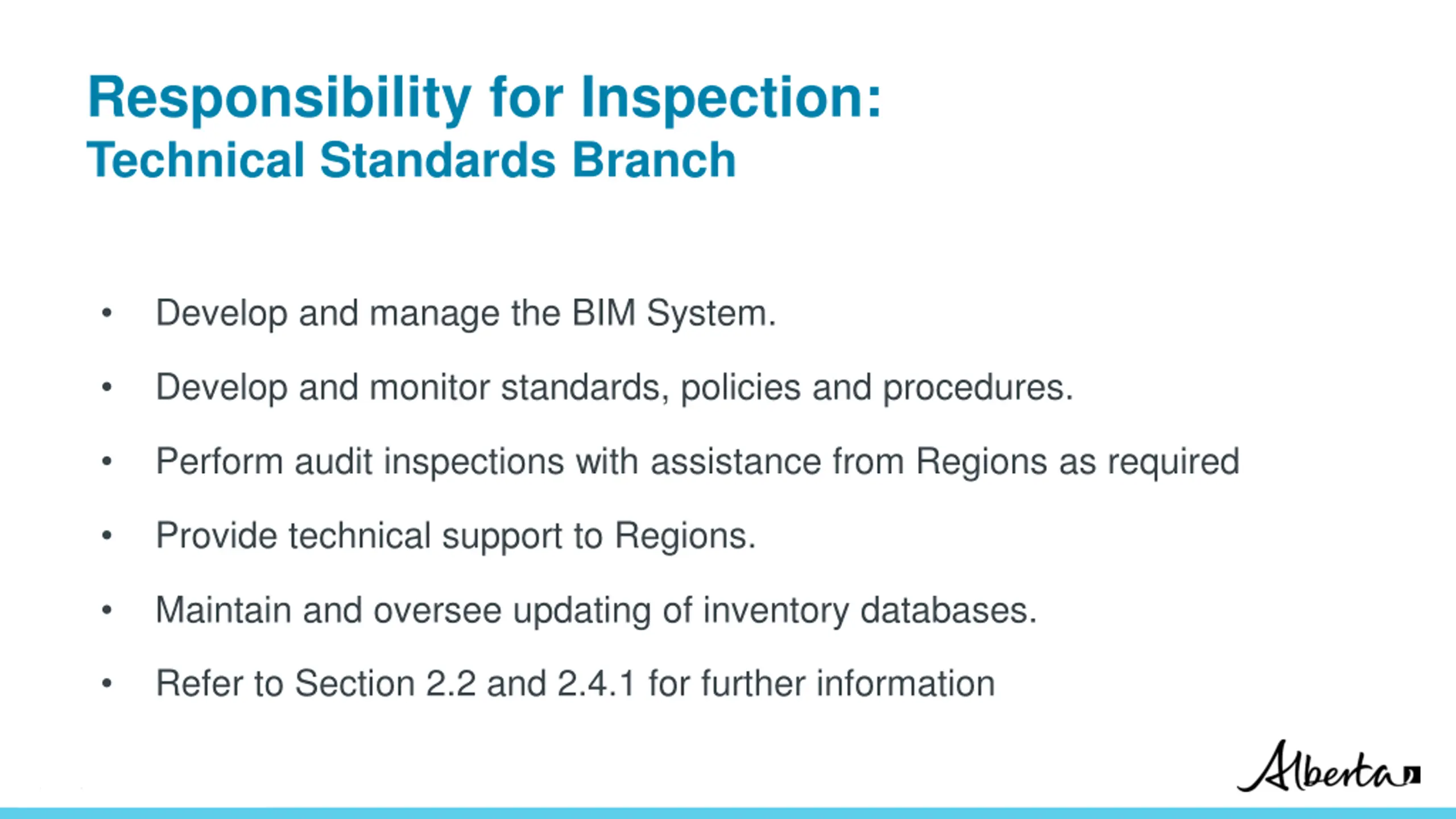 Responsibility for Inspection: Technical Standards Branch Develop and manage the BIM System. Develop and monitor standards, policies and procedures. Perform audit inspections with assistance from Regions as required Provide technical support to Regions. Maintain and oversee updating of inventory databases. Refer to Section 2.2 and 2.4.1 for further information Classification: Protected A