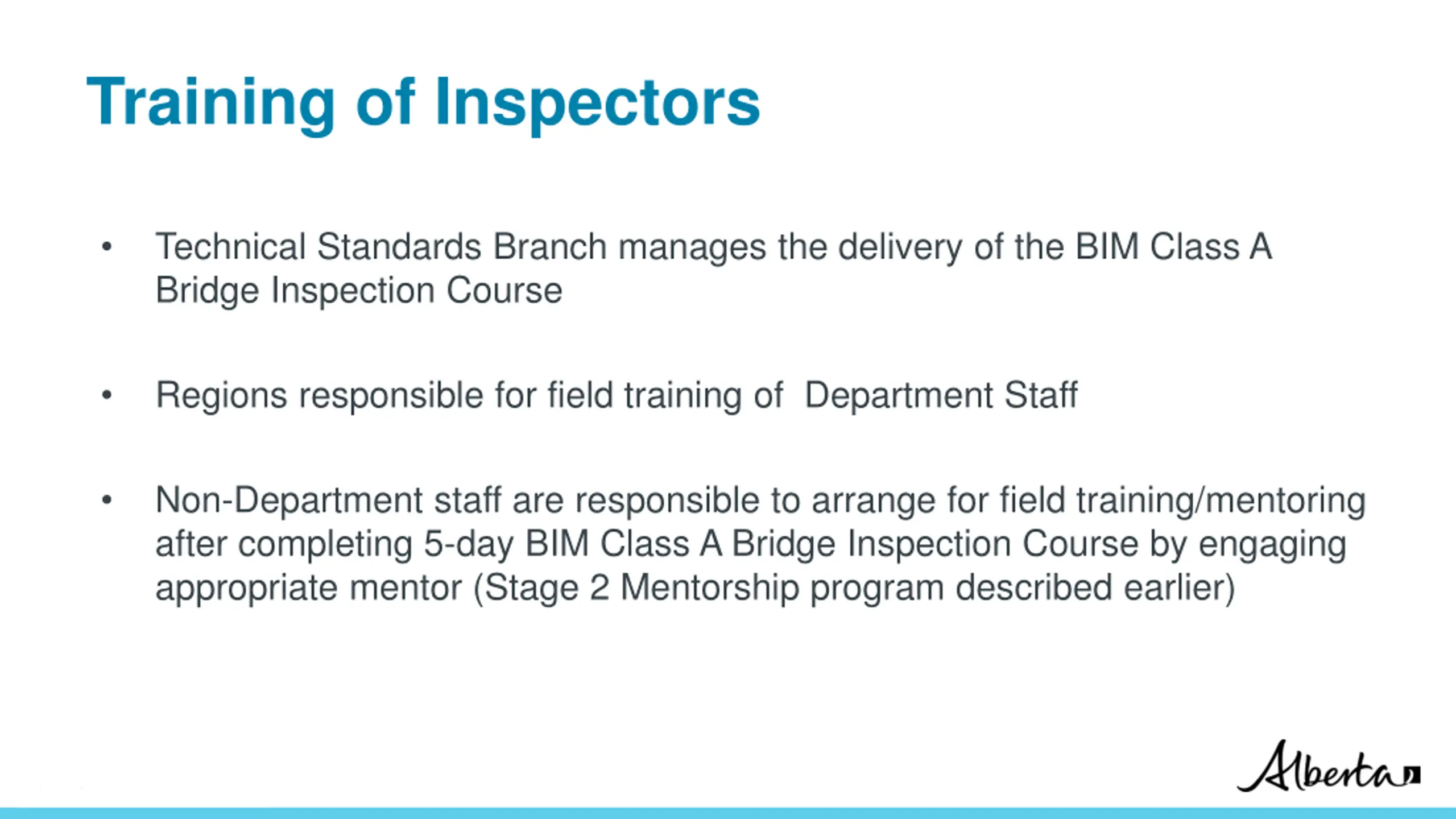 Training of Inspectors Technical Standards Branch manages the delivery of the BIM Class A Bridge Inspection Course Regions responsible for field training of Department Staff Non-Department staff are responsible to arrange for field training/mentoring after completing 5-day BIM Class A Bridge Inspection Course by engaging appropriate mentor (Stage 2 Mentorship program described earlier) Classification: Protected A