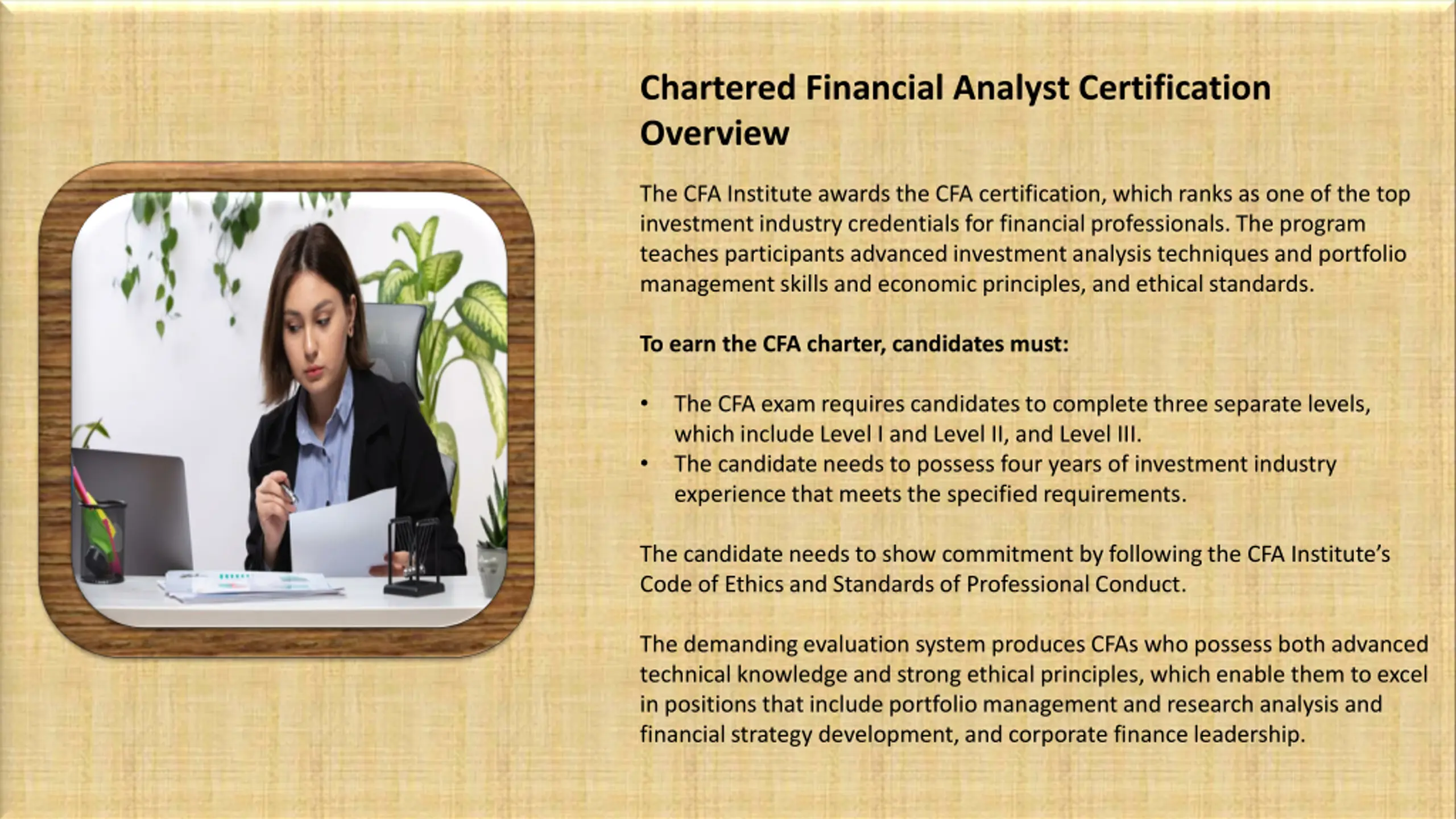 Chartered Financial Analyst Certification Overview The CFA Institute awards the CFA certification, which ranks as one of the top investment industry credentials for financial professionals. The program teaches participants advanced investment analysis techniques and portfolio management skills and economic principles, and ethical standards. To earn the CFA charter, candidates must: The CFA exam requires candidates to complete three separate levels, which include Level I and Level II, and Level III. The candidate needs to possess four years of investment industry experience that meets the specified requirements. The candidate needs to show commitment by following the CFA Institute s Code of Ethics and Standards of Professional Conduct. The demanding evaluation system produces CFAs who possess both advanced technical knowledge and strong ethical principles, which enable them to excel in positions that include portfolio management and research analysis and financial strategy development, and corporate finance leadership.