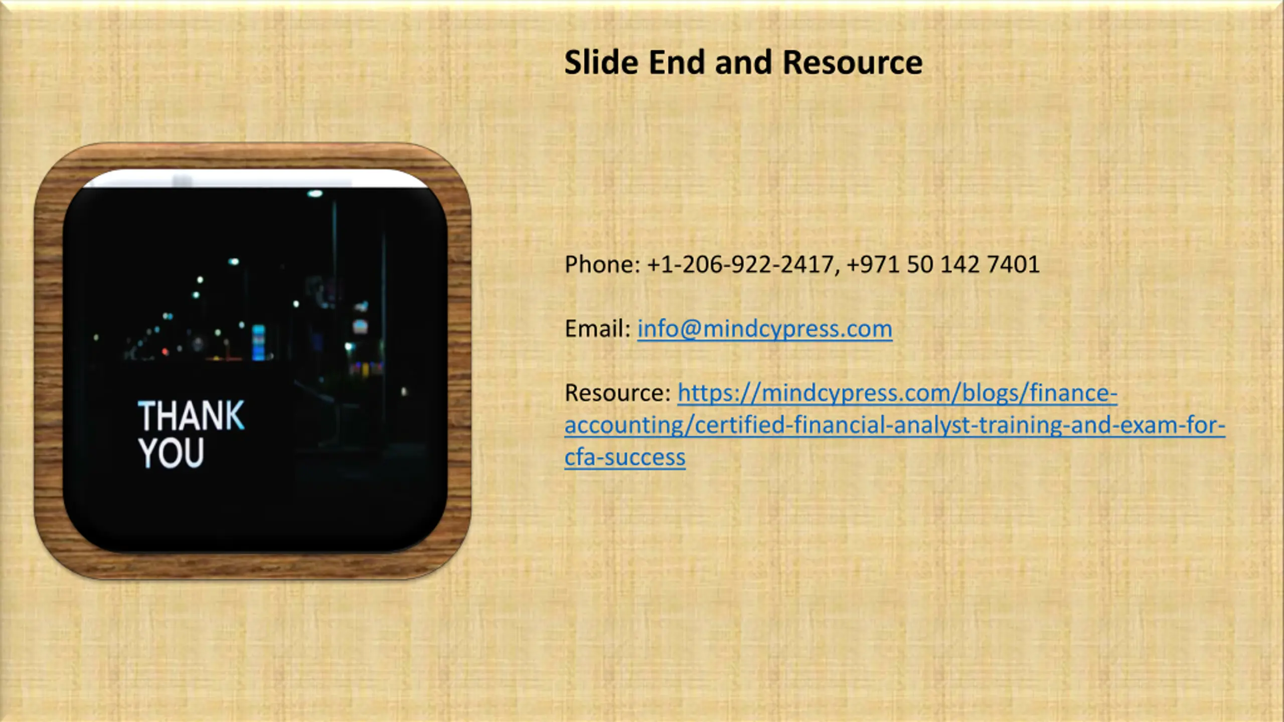 Slide End and Resource Phone: +1-206-922-2417, +971 50 142 7401 Email: info@mindcypress.com Resource: https://mindcypress.com/blogs/finance- accounting/certified-financial-analyst-training-and-exam-for- cfa-success