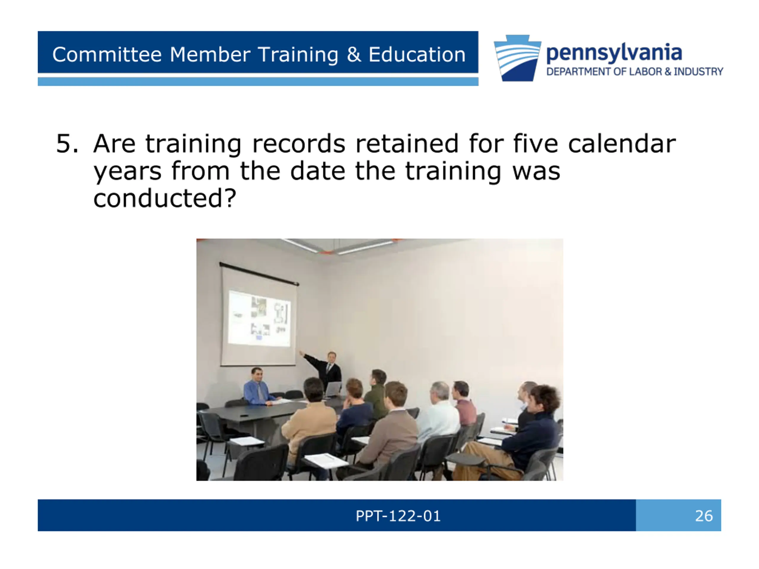 Committee Member Training & Education 5. Are training records retained for five calendar years from the date the training was conducted? PPT-122-01 26
