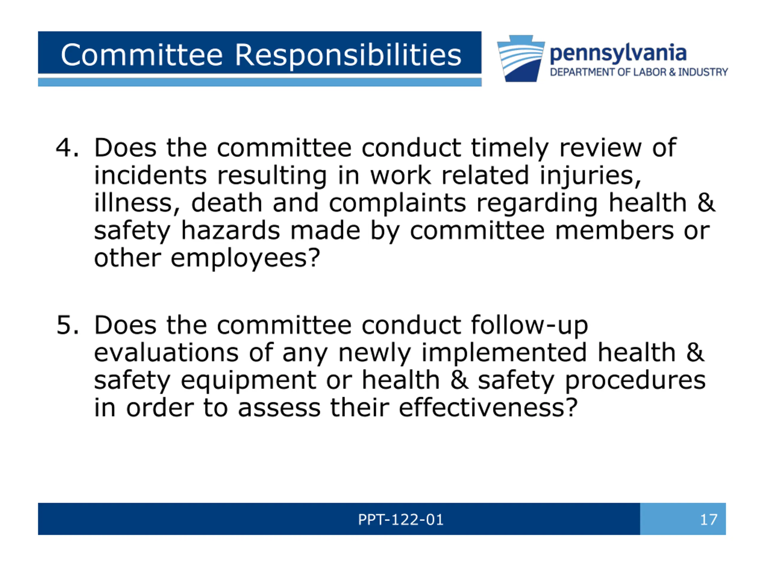 Committee Responsibilities 4. Does the committee conduct timely review of incidents resulting in work related injuries, illness, death and complaints regarding health & safety hazards made by committee members or other employees? 5. Does the committee conduct follow-up evaluations of any newly implemented health & safety equipment or health & safety procedures in order to assess their effectiveness? PPT-122-01 17