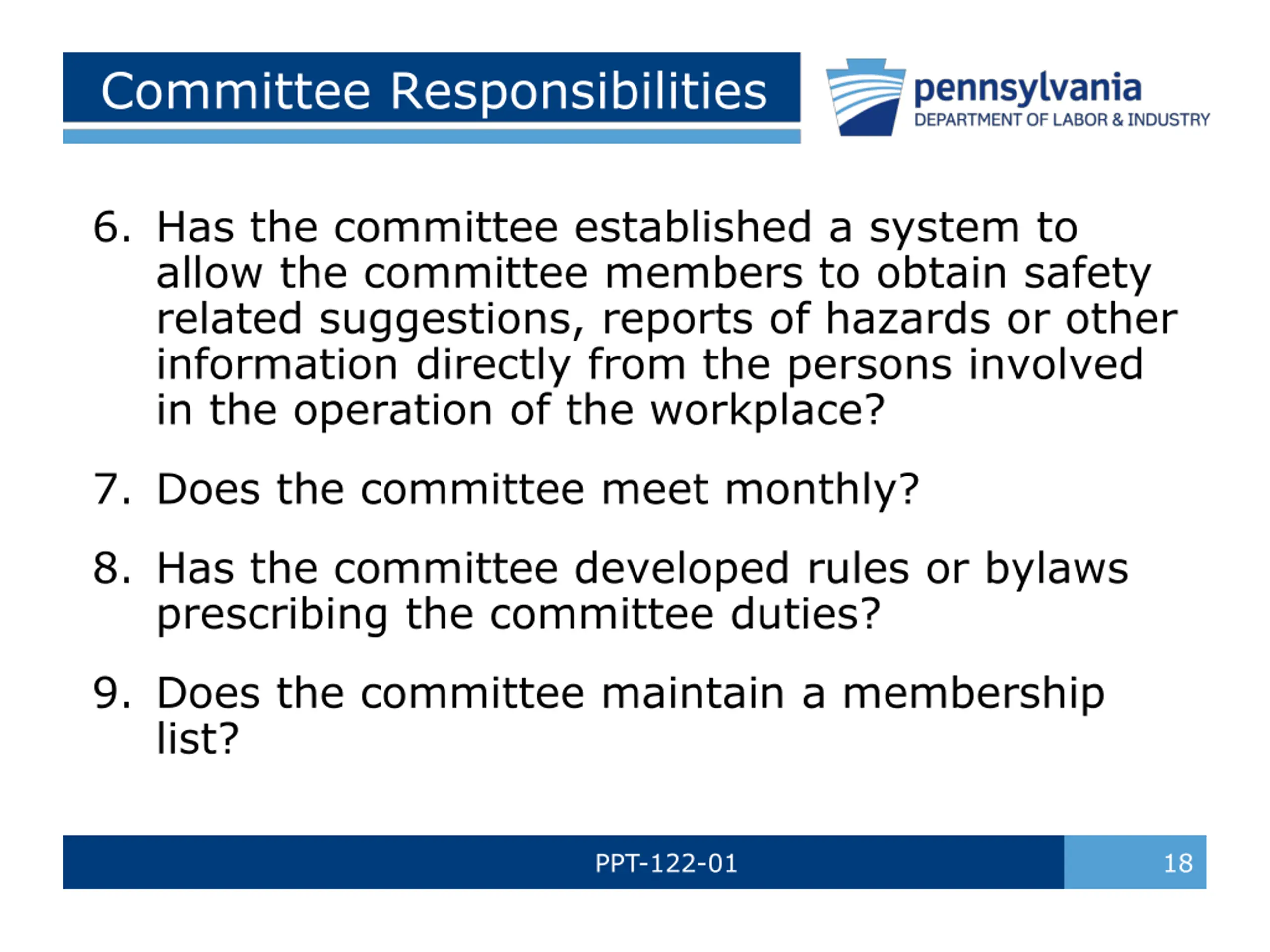 Committee Responsibilities 6. Has the committee established a system to allow the committee members to obtain safety related suggestions, reports of hazards or other information directly from the persons involved in the operation of the workplace? 7. Does the committee meet monthly? 8. Has the committee developed rules or bylaws prescribing the committee duties? 9. Does the committee maintain a membership list? PPT-122-01 18