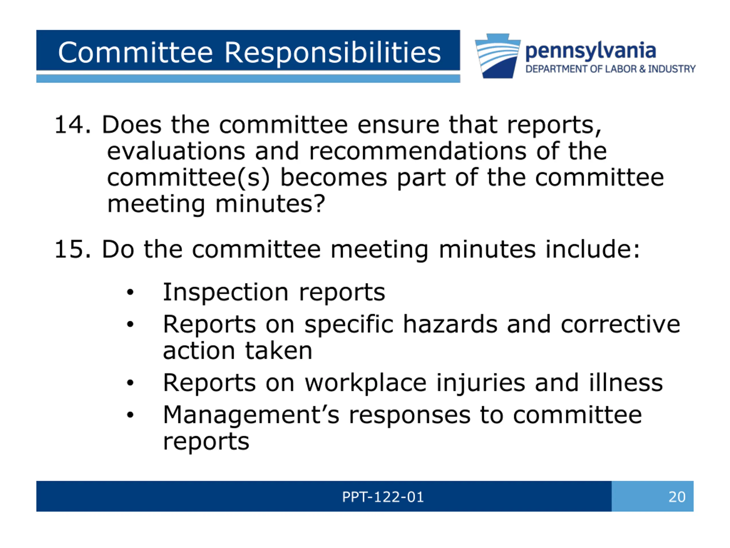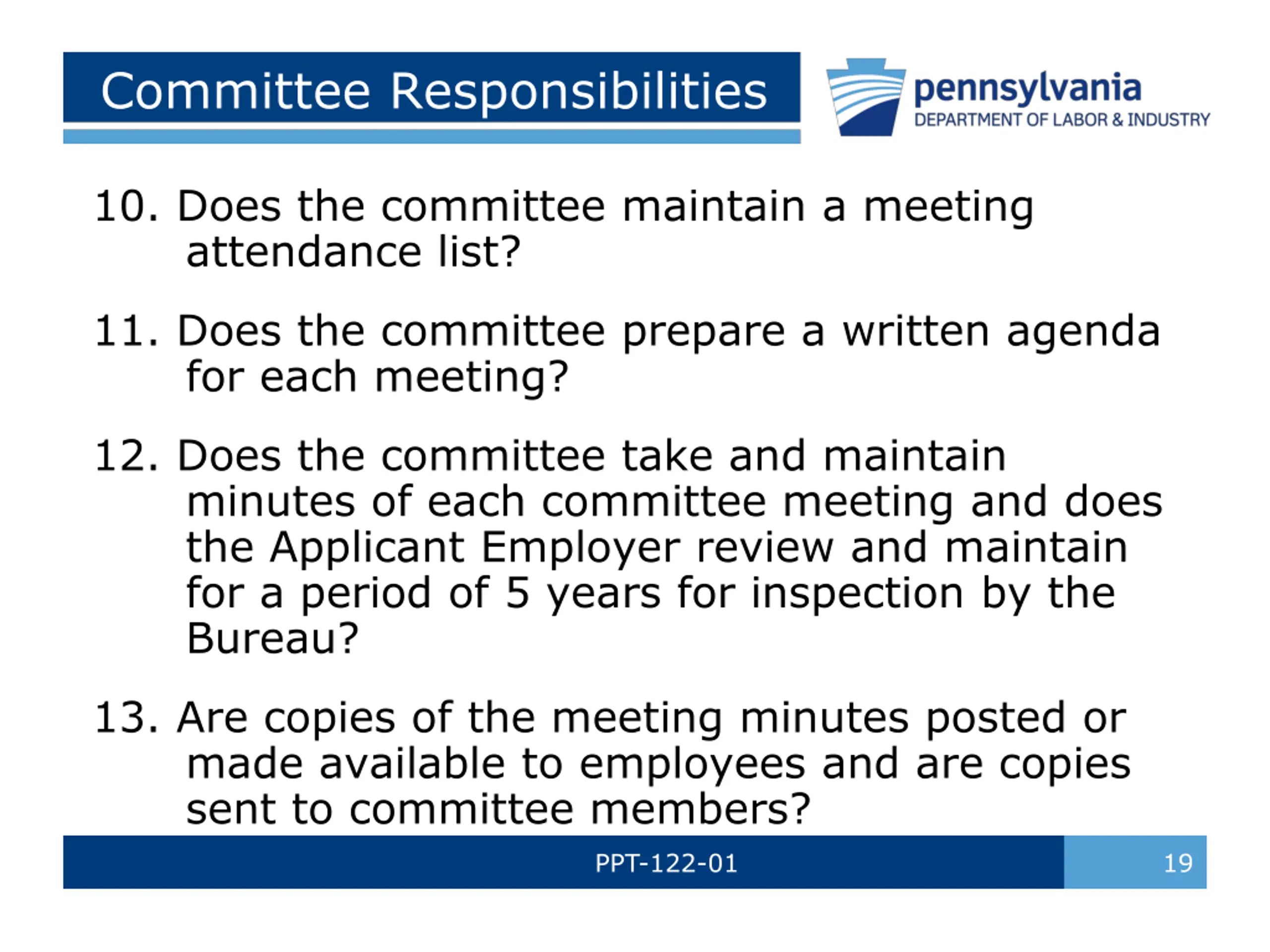 Committee Responsibilities 10. Does the committee maintain a meeting attendance list? 11. Does the committee prepare a written agenda for each meeting? 12. Does the committee take and maintain minutes of each committee meeting and does the Applicant Employer review and maintain for a period of 5 years for inspection by the Bureau? 13. Are copies of the meeting minutes posted or made available to employees and are copies sent to committee members? PPT-122-01 19