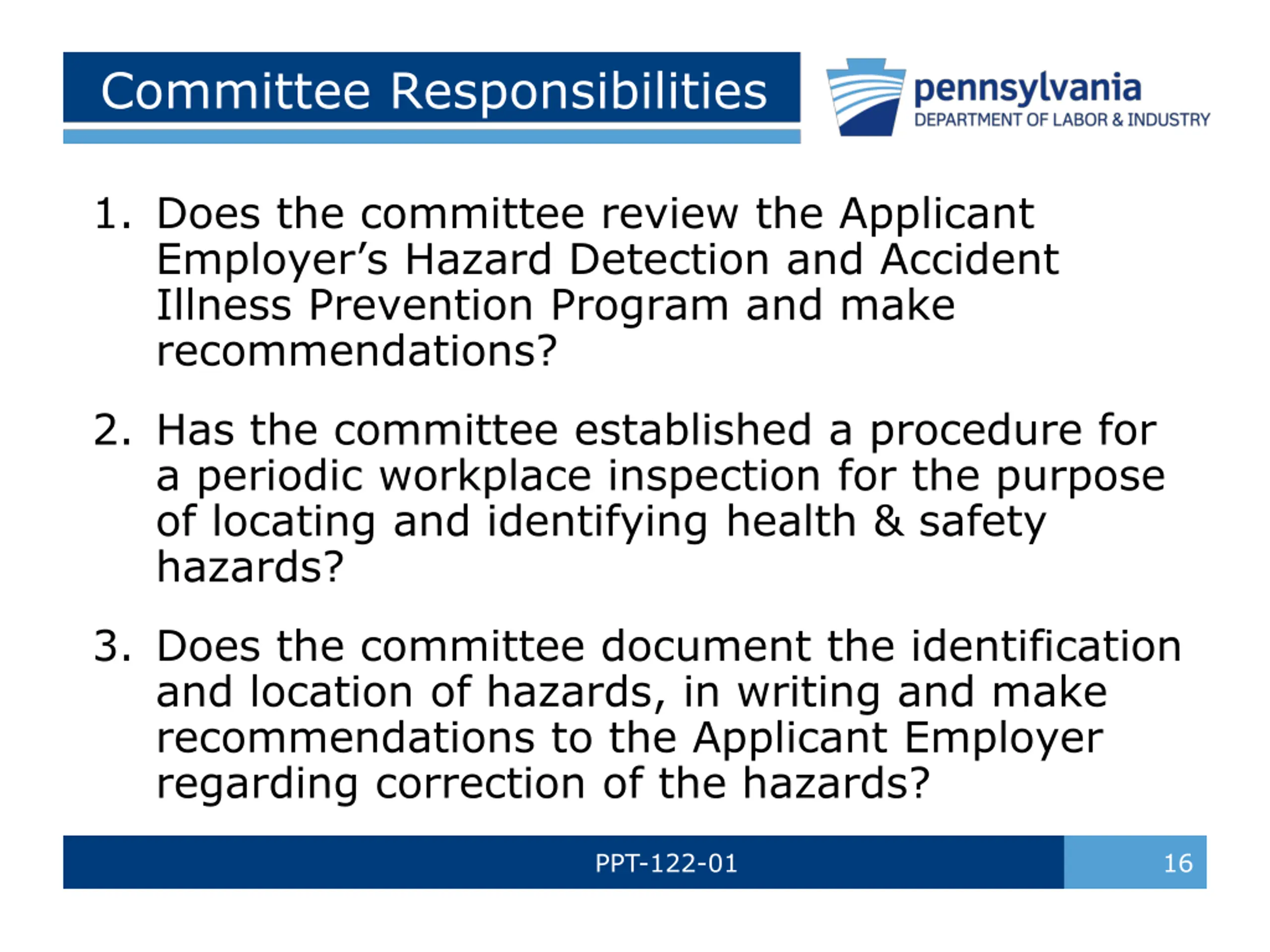 Committee Responsibilities 1. Does the committee review the Applicant Employer s Hazard Detection and Accident Illness Prevention Program and make recommendations? 2. Has the committee established a procedure for a periodic workplace inspection for the purpose of locating and identifying health & safety hazards? 3. Does the committee document the identification and location of hazards, in writing and make recommendations to the Applicant Employer regarding correction of the hazards? PPT-122-01 16