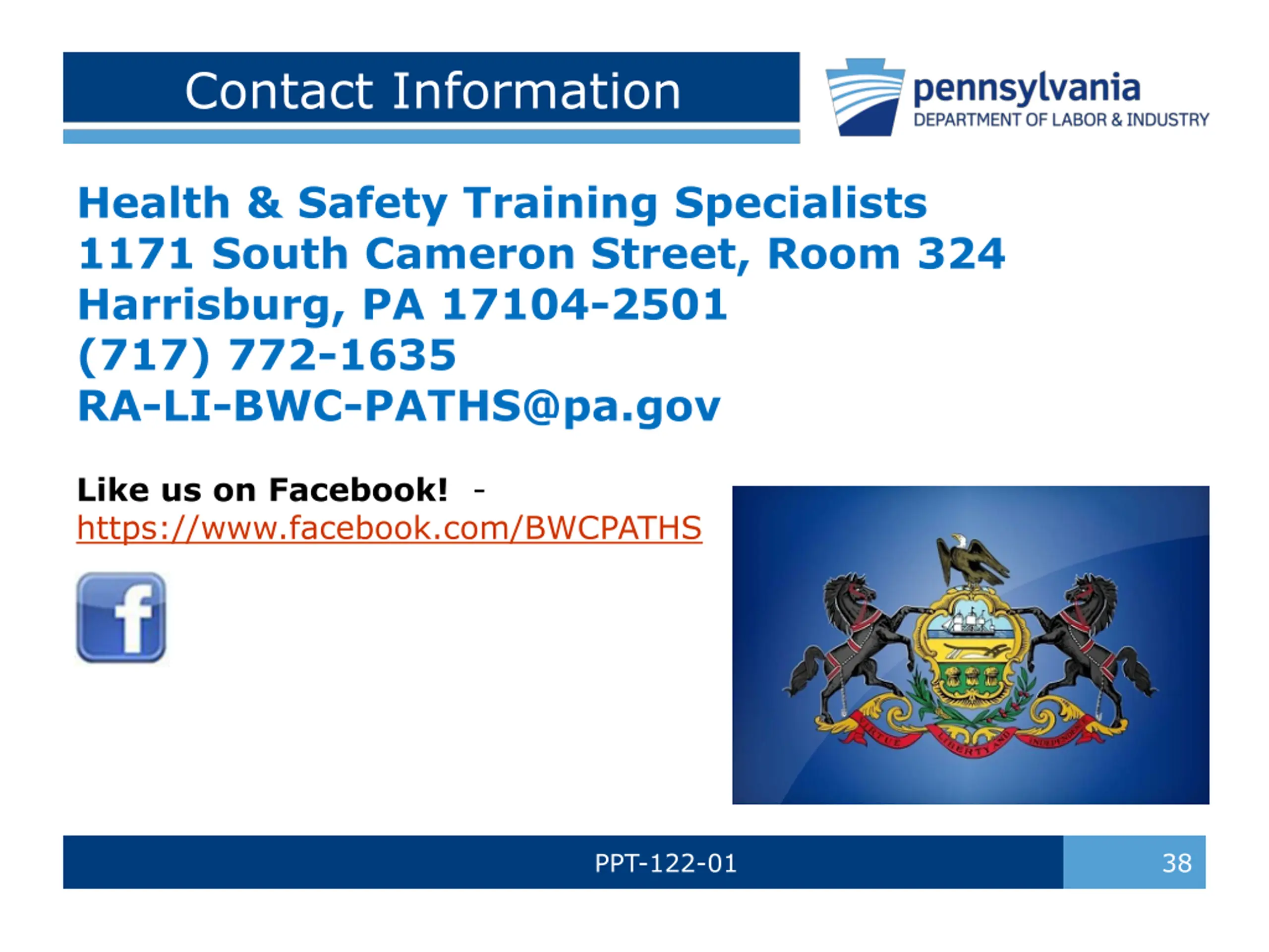 Contact Information Health & Safety Training Specialists 1171 South Cameron Street, Room 324 Harrisburg, PA 17104-2501 (717) 772-1635 RA-LI-BWC-PATHS@pa.gov Like us on Facebook! - https://www.facebook.com/BWCPATHS PPT-122-01 38