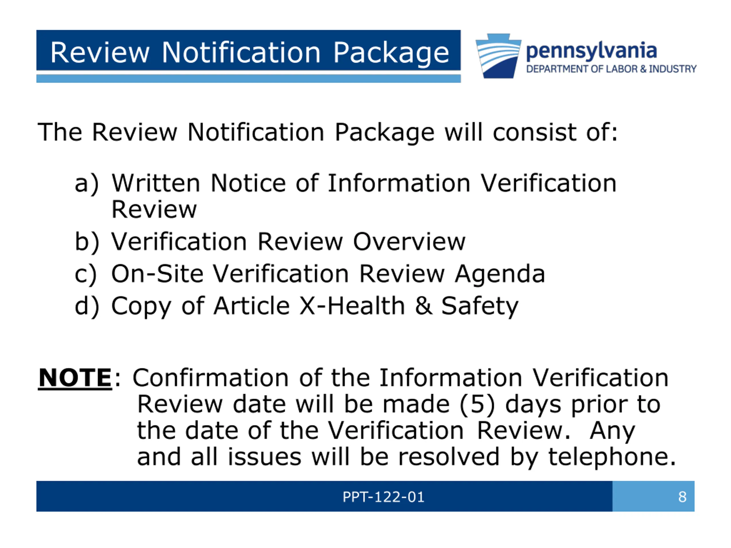 Review Notification Package The Review Notification Package will consist of: a) Written Notice of Information Verification Review b) Verification Review Overview c) On-Site Verification Review Agenda d) Copy of Article X-Health & Safety NOTE: Confirmation of the Information Verification Review date will be made (5) days prior to the date of the Verification Review. Any and all issues will be resolved by telephone. PPT-122-01 8