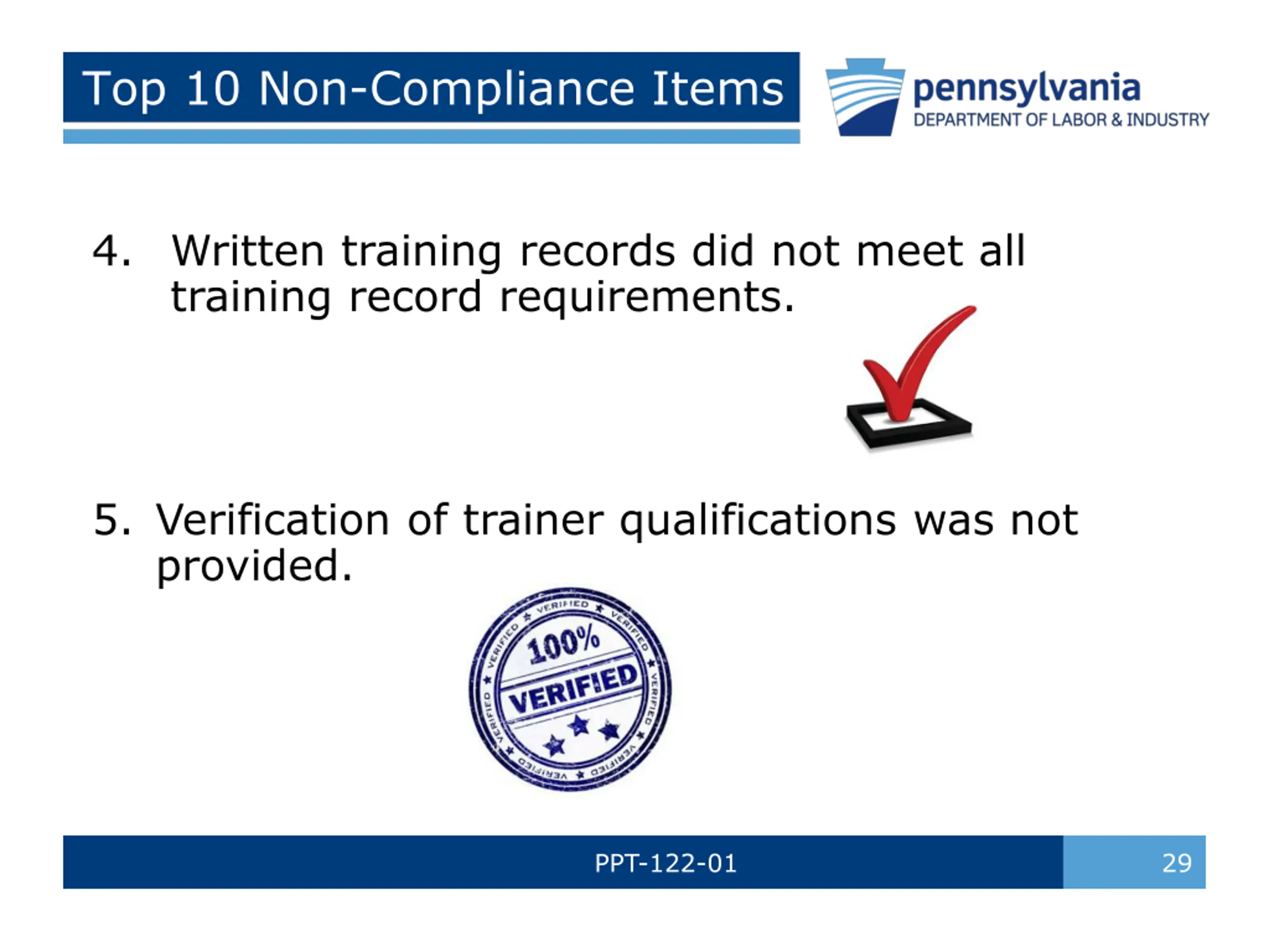 Top 10 Non-Compliance Items 4. Written training records did not meet all training record requirements. 5. Verification of trainer qualifications was not provided. PPT-122-01 29