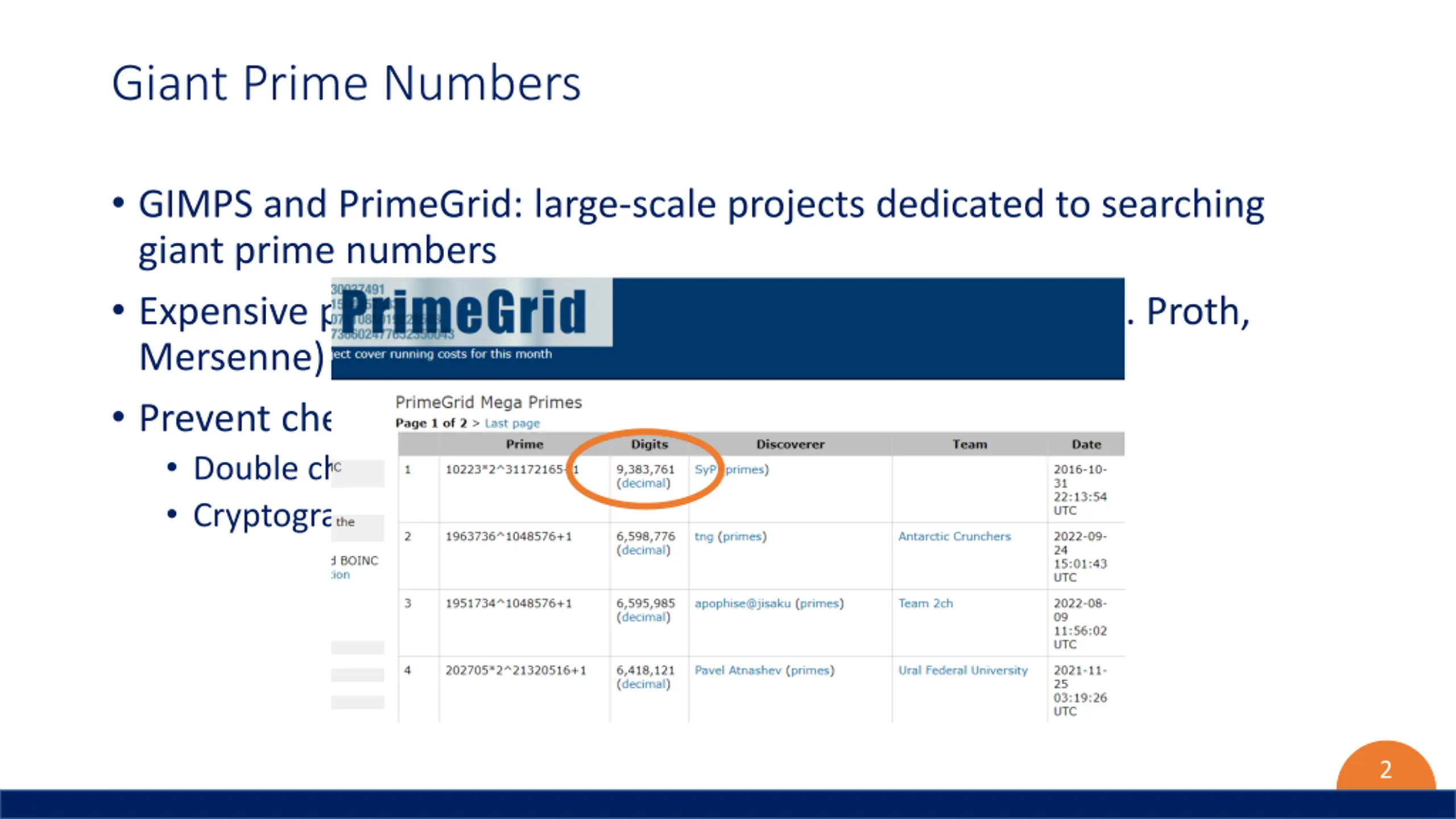 Giant Prime Numbers GIMPS and PrimeGrid: large-scale projects dedicated to searching giant prime numbers Expensive primality tests for numbers of special form (e.g. Proth, Mersenne) Prevent cheating and computation errors: Double checking Cryptographic proofs? 2