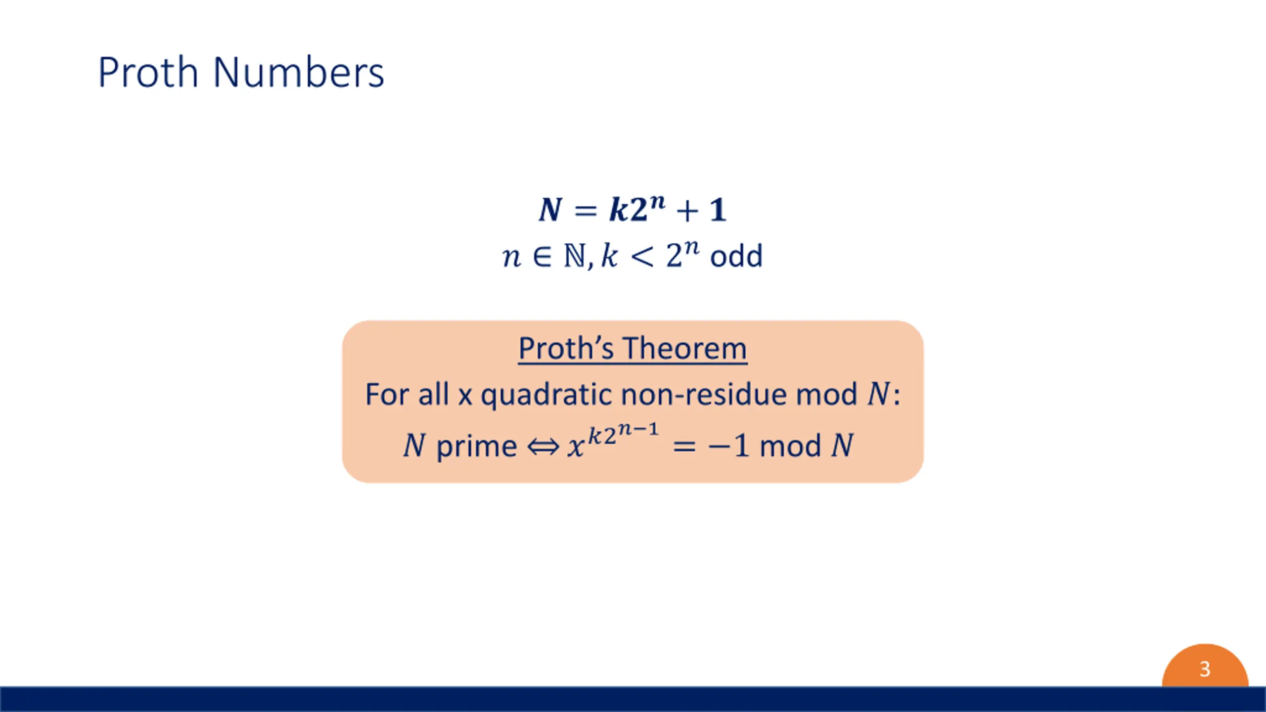 Proth Numbers ? = ???+ ? ? ,? < 2? odd Proth s Theorem For all x quadratic non-residue mod ?: ? prime ??2? 1= 1 mod ? 3