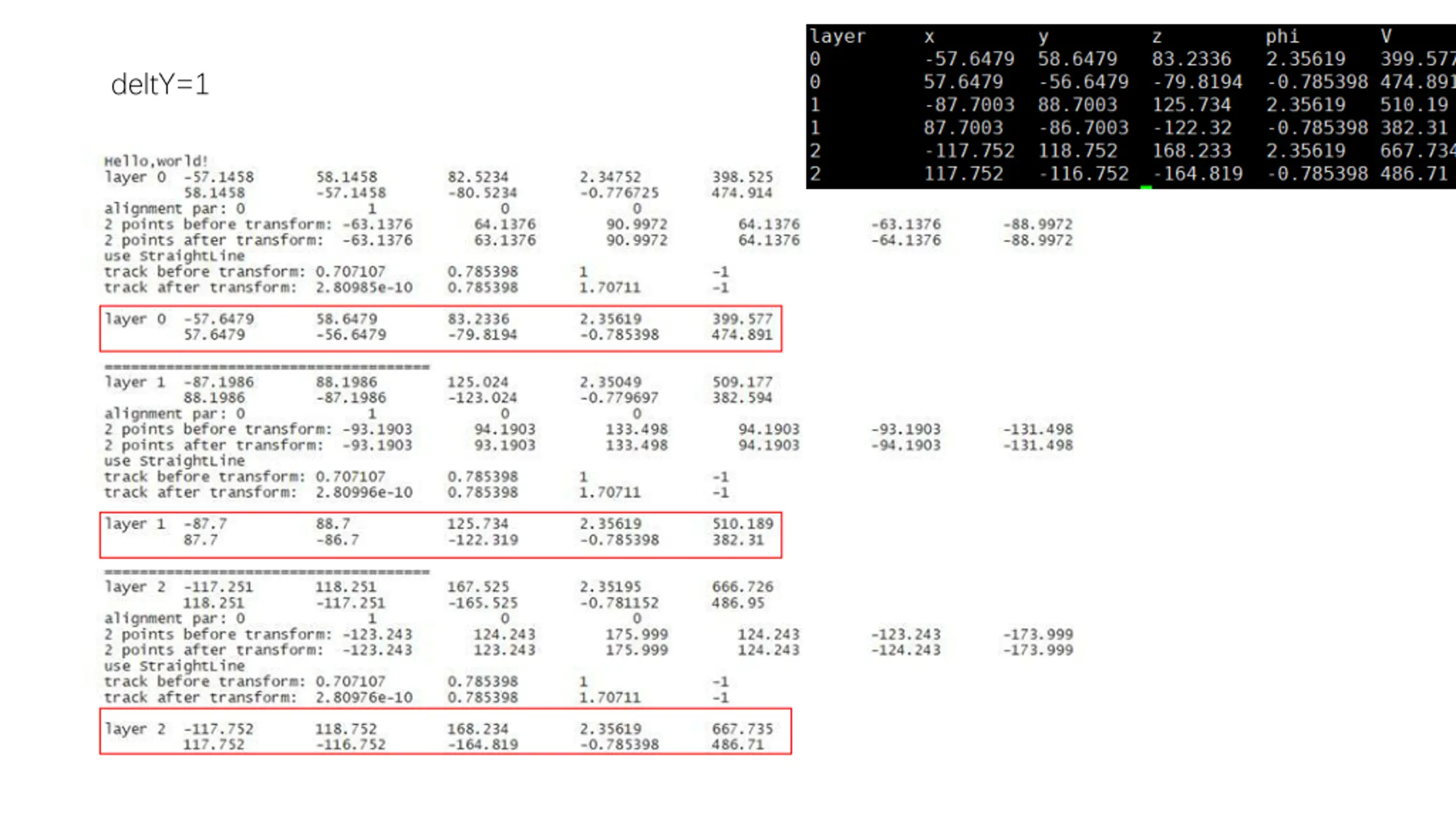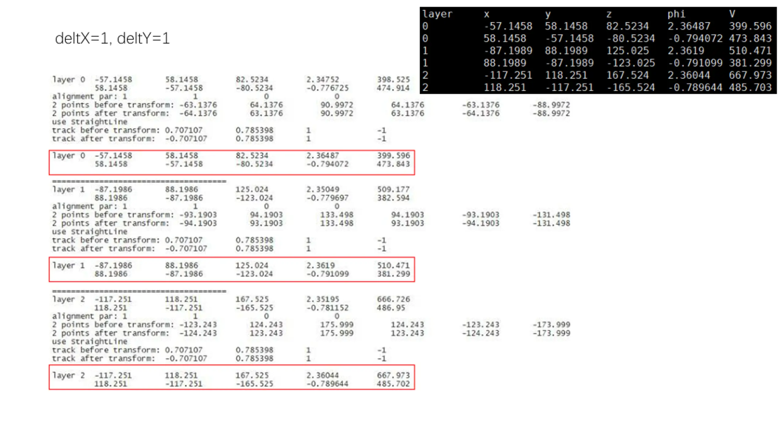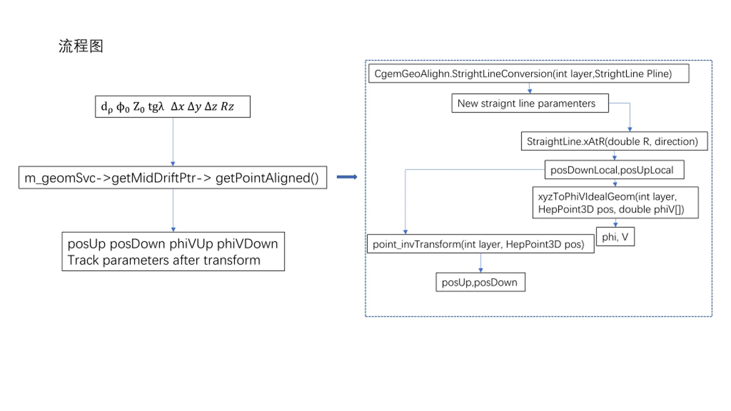 CgemGeoAlighn.StrightLineConversion(int layer,StrightLine Pline) New straignt line paramenters d 0Z0tg ? ? ? ?? StraightLine.xAtR(double R, direction) posDownLocal,posUpLocal m_geomSvc->getMidDriftPtr-> getPointAligned() xyzToPhiVIdealGeom(int layer, HepPoint3D pos, double phiV[]) phi, V posUp posDown phiVUp phiVDown Track parameters after transform point_invTransform(int layer, HepPoint3D pos) posUp,posDown