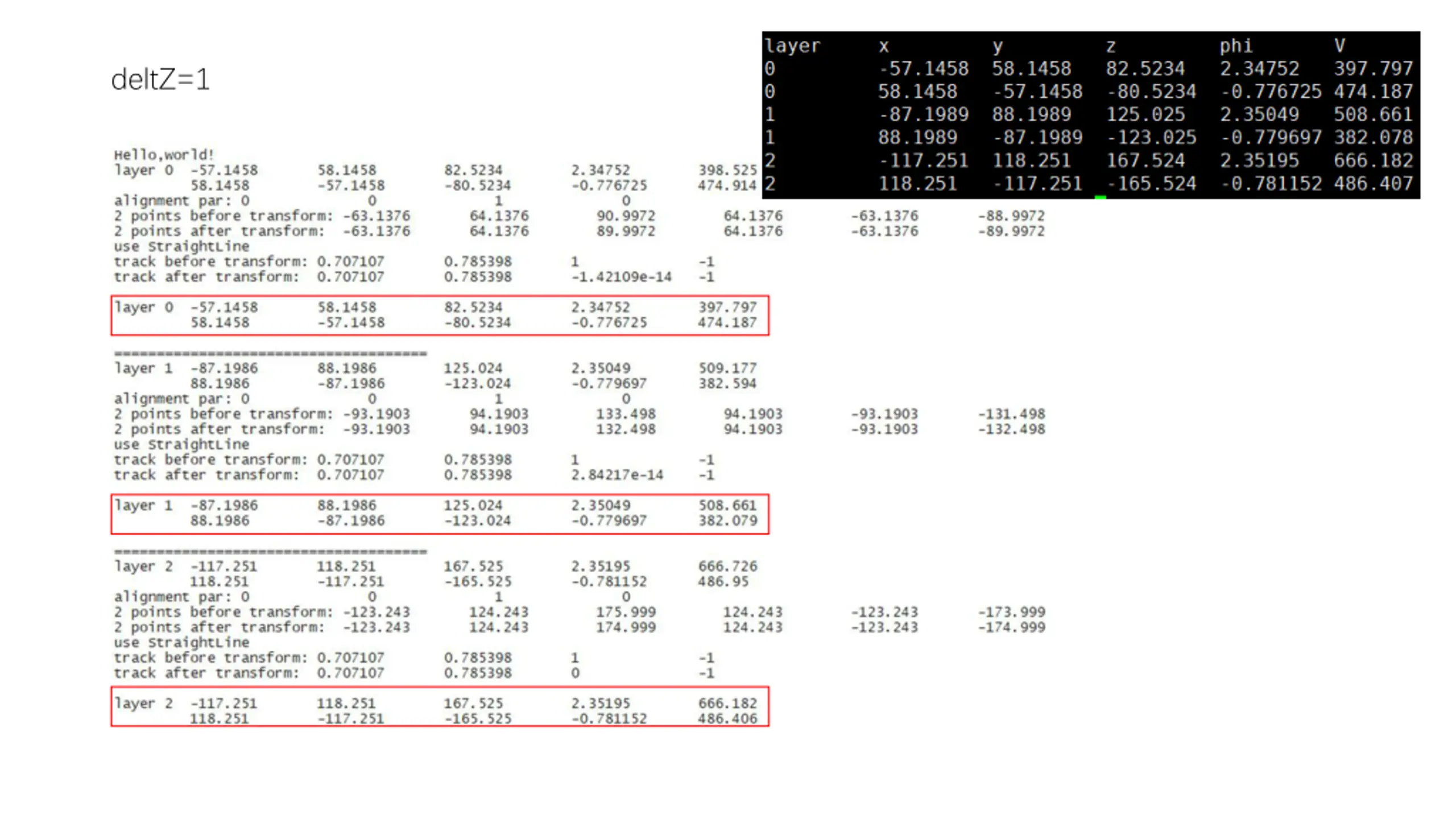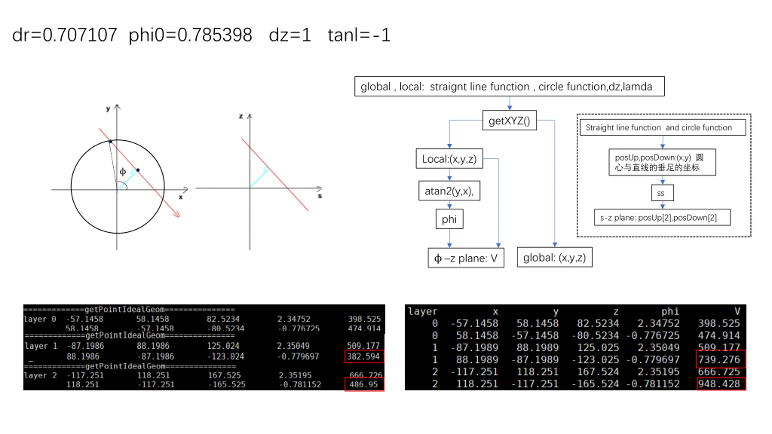 dr=0.707107 phi0=0.785398 dz=1 tanl=-1 global , local: straignt line function , circle function,dz,lamda getXYZ() Straight line function and circle function Local:(x,y,z) posUp,posDown:(x,y) atan2(y,x), ss s-z plane: posUp[2],posDown[2] phi global: (x,y,z) z plane: V