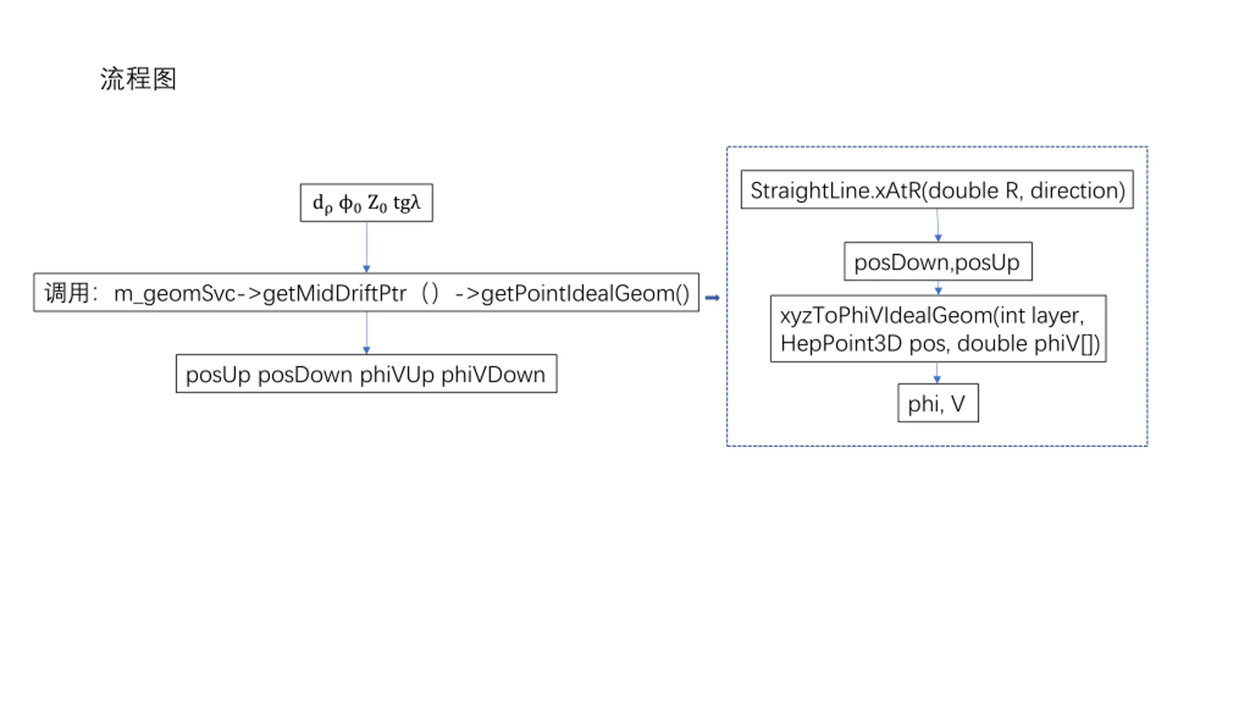 StraightLine.xAtR(double R, direction) d 0Z0tg posDown,posUp m_geomSvc->getMidDriftPtr ->getPointIdealGeom() xyzToPhiVIdealGeom(int layer, HepPoint3D pos, double phiV[]) posUp posDown phiVUp phiVDown phi, V