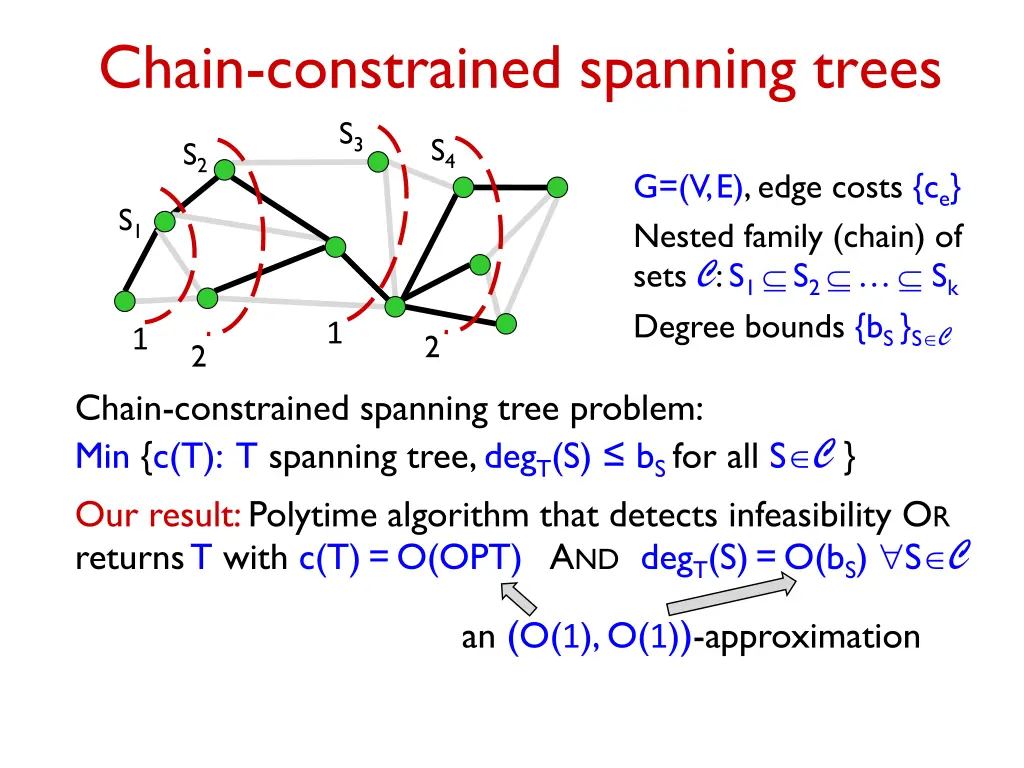 Chain-constrained spanning trees S3 S4 S2 G=(V,E), edge costs {ce} Nested family (chain) of sets : S1 S2 Sk Degree bounds {bS }S S1 1 1 2 2 Chain-constrained spanning tree problem: Min {c(T): T spanning tree, degT(S) bS for all S } Our result: Polytime algorithm that detects infeasibility OR returns T with c(T)=O(OPT) AND degT(S)=O(bS) S an (O(1), O(1))-approximation